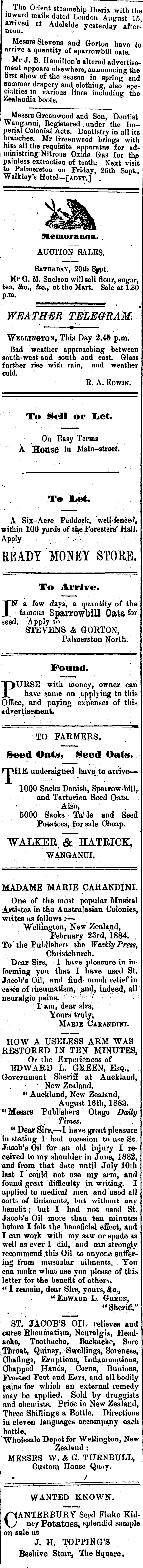 The i Orient steamship Iberia with the inward mails dated London August 15 arrived at Adelaide yesterday afternoon. Messrs Stevens aud Gorton liave to arrive a quantity of sparrowbill oats. Mr J. B. Hamilton's altered advertisement appears elsewhere, announcing the first show of the season m spring and summer drapery and clothing, also specialties m various lines including the Zealandia boots. Messrs Greenwood and Son, Dentist Wanganui, Registered under the Im- ! perial Colonial Acts/ Dentistry m ail its branches. Mr Greenwood brings with him all the requisite apparatus "for administring Nitrous Oxide Gas for tlyj painless extraction of teeth. Next visit to Palmerston on Friday, 26th Sept.. Walkley's Hotel— [advt.], Memoranda. AUCTION SALES. Saturday, 20th Sfpt. Mr G. M. Snelson will sell flour, sugar, tea, &c, &c, at the Mart. Sale at 1.30 p.m. weather telegram. "Wellington, This Day 2.45 p.m. Bad weather approaching between south-west and south and east. Glass further rise with rain, and weather cold. R. A. Edwin. To Sell or liet. On Easy Terms A House m Main-street. To TteU A Six-Acre Paddock, well-fenced, within 100 yards of the Foresters' Hall. Apply. '.; , . ■•; ;ly :■■■■/■. v . ./' READY MONEY STORE. To Arrive. IN a few days, a quantity of the famous Sparrowbill Oats for seed. Apply to STEVENS & GORTON, Pahnerston North. Found. T)iURSE with money, owner can _L have same on applying to this Office, and paying expenses of this advertisement. TO FARMERS. Seed Oats, Seed Oats. rp.UE undersigned haveto arrive— 1000 Sacks Danish, Sparrow -hill, and Tartarian Seed Oats. Also, 5000 Sacks TaUe and Seed Potatoes, for sale Cheap. "WALKEE &"hATRICE:, WANGANUI. MADAME MARIE CARANDINI. One of the most popular Musical Artistes m the Australasian Colonies, writes as follows :— "Wellington, New Zealand, February 23rd, 1884. . To the Publishers the Weekly Press, Christchurch. Dear Sirs, — 1 have pleasure m informing you that I have used St. Jacob's Oil, and find much relief m cases of rheumatism, and, indeed} all neuralgic pains. h! " ; I am, dear sirs, "Yours trulyi Marie Cabandjni. HOW A USELESS ARM WAS RESTORED IN TEN MINUTES, Or the Experiences of EDWARD L. GREEN, Esq., Government Sheriff at Auckland, New Zealand. "Auckland, New Zealand, August 16th, 1883. "Messrs Publishers Otago Daily Times. " Dear Sire,-— I have groat pleasure m stating L had occasion to use St. Jacob's Oil for an old injury I received to my shoulder m June, 1882, and from that date until July 10th last I could not use my arm, and found great difficulty m writing. I applied to medical men and used all sorts of liniments, but without any benefit ; but I had not used St. Jacob's Oil more than ten minutes before I felt the beneficial effect, and I can work with my saw or spade as well as ever I did, and can strongly recommend this Oil to anyone suffering from muscular ailments. . You can make what/ use you please of this letter for the benefit of others. " I remain, dear Sirs, yours, &c, "Edward L. Green, "Shei-itf." ST. JACOB'S OIL relieves arid cures Rheumatism, Neuralgia, Headaohe, Toothache, Backache, Sore Throat, Quinay, Swellings, Soreness, Chafiugs, Eruptions, Inn 1 animations, Chapped Hands, Corns, Bunions, Frosted Feet and Ears, and all bodily pains for which an external remedy may be applied. Sold by druggists and chemists. Pride m New Zealand, Three Shillings a Bottle. Directions m eleven languages accompany each bottle. Wholesale Depot for Wellington, New Zealand : MESSRS W. & G. TURNBULL, Custom House Quay. • / WANTED KNOWN. /CANTERBURY Seed Fluke Kid\J ncy Potatoes, «plendid Maniple on sale at J. H. TOPPING'S Beehive Store, The Square.