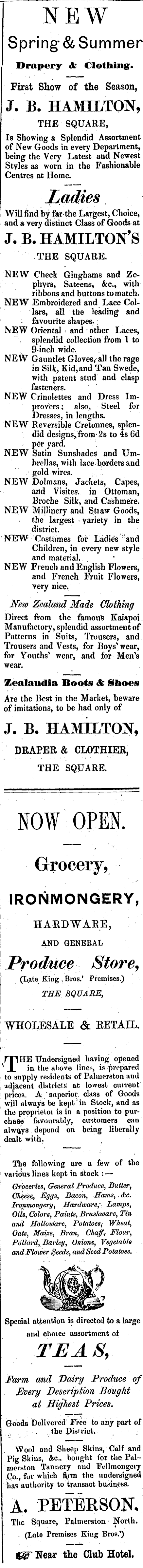 NEW Spring & Summer Drapery & Clothing. First Show of the Season, J. B. HAMILTON, THE SQUARE, Is Showing a Splendid Assortment of New Goods m every Department, being the Very Latest and Newest Styles as worn m the Fashionable Centres at Home. Ladies Will find by far the Largest, Choice, and a very distinct Class of Goods at J. B. HAMILTON'S THE SQUARE. NEW Check Ginghams and Zephyrs, Sateens, &c, with ribbons and buttons to match. NEW Embroidered and Lace Collars, all the leading and < favourite shapes. NEW Oriental • and other Laces, splendid collection from 1 to 9-inch wide. NEW Gauntlet Gloves, all the rage m Silk, Kid, and Tan Swede, with patent stud and clasp fasteners. NEW Crinolettes and Dress Improvers; also, Steel for Dresses, m lengths. NEW Reversible Cretonnes, splendid designs,.from 2s to 4s 6d per yard. ; NEW Satin Sunshades and Umbrellas, wi tb lace borders and gold wires. NEW Dolmans, Jackets, Capes, and Visites. m Ottoman, Broche Silk, and Cashmere. NEW Millinery and Stiaw Goods, the largest -yariety m the district. 'NEW 1 - ' Costumes for Ladies and Children, m every new style and material. NEW French and English Flowers, and French Fruit Flowers, very nice. New Zealand Made Clothing Direct from the famous Kaiapoi. Manufactory, splendid assortment of Patterns m Suits, Trousers, and. Trousers and Vests, for Boys'* wear, for Youths' wear, and for Men's wear. Zealandia Boots & Shoes Are the Best m the Market, beware of imitations, to be had only of J. B. HAMILTON, DRAPER & CLOTHIER, THE SQUARE. NOW OPEN. Grocery, IRONMONGERY, HARDWARE, AND GENERAL Produce Store , (L.ate King .. Bros.' Premises.) THE SQUARE, WHOLESALE & RETAIL. nnHE Undersigned having opened v I m the al»ove lines is prepared to supply residents of Palmerston and adjacent districts at lowest current prices. A * superior, class of Goods will always be kept 'in Slock, and as the proprietoi is iv a position to purchase favourably, customers can always . depend on being liberally dealt with. The following are a few of the various lines kept m stock : — Groceries, General Produce, Butter, Cheese., Eggs, Bacon, Hams,.&c. Ironmongery^ Hardware,- Lamps, Oils, Colors, Paints, Brushioare, Tin and ffolloware. Potatoes,- Wheat, Oats, Maize, Bran, Chaff? Flour, Pollard, Barley, Onions, Vegetable and Flower Seeds, and Seed Potatoes. Special attention is directed to a large and choice assortment ot TEAS,: Farm and Dairy Produce of Every Description Bought at Highest Prices. Goods Delivered Free to any part of . ihe piamet. Wool and Sheep Skins, Calf and Pig Skins, &c bought for the Palraerston Tannery and Fellmongery Co., for which firm the undersigned has authority to transact business. A. PETERSON, The Square, Palmerston North. • (Late Premises King Bros. 1 ) f^ Near the Club Hotel.