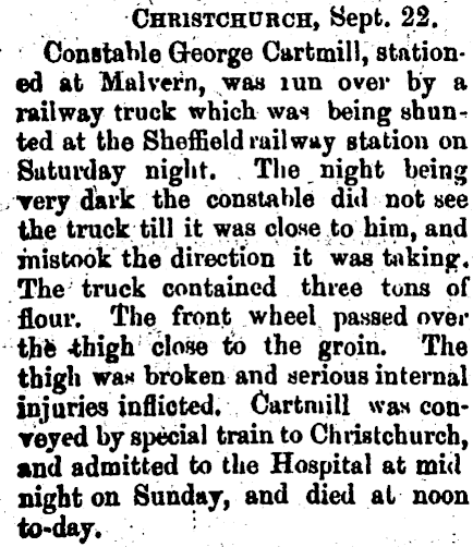 Christchurch, Sept. 22. Constable George Cartmill, stationed at Malvern, was lun over by a railway truck which was being shunted at the Sheffield railway station on Saturday night. . The , night being /Tery dark the constable did not see the truck till it was close to him, and inistook the direction it was taking. The truck contained three tons of flour. The front wheel passed over the -thigh close to the groin. The thigh was broken and serious internal injuries inflicted. Cartmill was con* reyed by special train to Christchurch, . and admitted to the Hospital at mi<l night on Sunday, and died at noon to-day> :