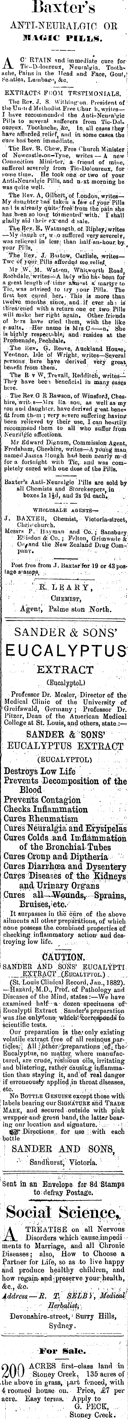 Baxter's ANTI-NEURALGTO OE AC 1 RTATN ?md immediate cure for Tif-D-lonreujc, Neuraljjia, Toothn ache, Pains m the Head and Face, Gout,! LutnbatTiv &c, ' EXTRACTS FHOVI TK;STI^^O^fIALB. The Re.v. J. S. Witliiujj-on. President of thepmtrd Methodist Free Uhur h, writfts I have recommended the Antf-Neiir/Ujjic PiHs to several sufferers from Tic-Dai, oareux. Toothache, &c, In, all cpsea they ! have afforded, relief, and m some caßea the • cure has been imine'ciiiite. the Rev. B, Gbew, Free Church Minister \ of Newciisfcle-on-Tyne, writes — A new • Connection Minister, a- friend of mitie, ' suffered severely from Tic-Do!oureux, for i sometime. He took one or two of your AntiaNeurali;ic Pills, and n.-xt morning he was quite well. . ; . The Key. A. Gilbeftj of. f.pndon,. writes— My dnuij liter has takt-u ft few ; cf your' Pills an 1 is already quite/ free" from the pain she has .btien so long tdi mented' with. I : shail gladly aid (hfir ex'end d sale. . The Rtrv. B. Watmogth, of. lßipley;- writes — VI y !3a,uph cr f vy.o suffered very severely, was relieved m less.; than half : an>-hour, by. your Pi'ls, : '.'....,, 4 'T.heJ?e,y.' J. I?!»tow, Carlisle, writes — Twc of ) : 9Hr ; l?iilß afforded me.reli^ . ; Ml- r \V^'M..VV"at--qn ( Whitwortb Rd6'hclale, ; writes—A larfy wlio haY been for a & eat length l of- vimp afainat a 1 martyr to Ti«, was advised to try yoiir Pills. The ! first box cured her. • This is more than twelve, months, sipce J; aDd.if ever, shi is' tHreaiened with a return one. or .two. Pille will noitiku her right again. Other fru-nds of h<rß have tried them, witb the like r-sajts. Her namje is Mrs C-i-— n." She is highly Tespecisbifti and resides at the Promenade, .Pechdale. ; -. . = The Hey. G. Reeve, Auckland Hou«e| Vetitnor, Isle 'of Wright, w.rites— Seyeral persdiis". here haVe derived' very great, benefit frbm tbena". : ' ',' The R v W, Trtyail, Rerlditco, write^— Thf-y have bee i benefici.il m many oasis here. ■ '■'■•'■' Tlie Rev. G R Rawson, of Winsforf, Cheshire, "writes— Mrs IJa, son, as wella3 : my f-onand daughter, have derived g "eat bene« fii from the.m ; very severe Buffering;havinir been relieved by their use, lean heartily, recomrneud them to all who suffer from Neuridgtc affections. Mr Edward Djsnum, Commission Agent, Frndßhamv Cheshire, writes^-A yduhg" mau, named Jaints Hough had been nearly nrid for a :for.t!iight with Tic, and was completely cured with one dose of the Pills. Baxter's Anti- Neuralgic Pills are sold by all Chemists and Storekeepers, m boxes. ls. lid, and 2s 9d each.; ..-,.- WHOLESALE AGENTS-T-; • .: J . B A XTJB B, Cheuiiat, Victoria-street, Chrisichun.h. • Messrs P. 1 liayman and Co. ;' Sansbury. E?iisdon" &' Co. ; Feltotij, Gnmwailc & . C<'/and tiie New Zealand Drug Com-" pany. - .. ■ Post free from J. BaxterforlQ or 43 postage s'auipa . ;i . ... ; . .. : :! ;. ; '.xleahy, ''■•■":'■,. Chemist, ' . Agent, Palme ston Norfcb. SANDER & SONS' EUCALYPTUS EXTRACT . (Eucalyptol.) Professor Dr. Hosier, Director of the Medical Clinic of the University of ' Grcifswald, Germany ; Professor Dr. Pitzor, Dean of the Anierican Medical College at St. Louis, and others, state :— SANDER & BONS' ! EUCALYPTUS EXTEACT (EUGALYPTOL) '.'.'.. Destroys Low Life . . ; ; Prevents Decomposition of the Blood PreveDlts Contagion ■ ; Cliecks Inflammation < Cures Rheumatism ; _ Cures Neuralgia' and Erysipelas Cures Colds and Itoflammatioii of the Bronchial- Tubes Cures jCroup and Diptheria Cures Diarrhoea and Dysentery Cures Diseases of the Kidnieys and; Urinary Organs Cures ail— Sprains, BruisesV'etc.It surpasses m the" cure of the ahove ailments all other preparations, of which nbne possess the. combined properties :of checking, inflammatory action* and destroying low life. ..;.;;. ClltfTiON. SANDER AND SONS' EUCALYPTI i ._ -EXTRACT. .tfiu.QALypTOL.) . . . ;..'.. (St. Louis Clinical Record, Jan., 1882). -•Hazard, M.D., Prof, of Pathology and Diseases of tlie Mind, states :— We have examined half- -a- dozen- specimens of" Eucalypti Extract . Sander's preparation was .theoßly^one; wirieh-^corresponds ia scientific tests. ... : Our preparation js .the/. only existing volatile extract free of all resinous partiql.es/] All i'pthergpreparations ;o|[tltio< Eucalyptns, no mat.tei^ where manufactured, are crude, resiiibus oils, irritating and blistering, rather causing inflammation than staying it, and, of real danger if erroneous^ applied .m throat diseases, etc. " ,: ■ . • ... No Bottle Genuine except those w i£h" : labels bearing our Signature a'iid Trade Mark, and secured outside with pink wrapper aud* green band, the latter bearing our location and signature. ' ; ; :-■••.:•.:: Ijgg? Directions;, for use ;; with each bottle I SATOER AND SONS, •• Sandhurst', Viotoria. 'Sent m an Envelope for 8d Stamps I to defray Postage. Social Seiefipe^ ;A TREATISE on all Nervous X3l Disorders \vrhich canse L impedi ihents to Marriage, and all Chronic Diseases ; also, How to Choose a partner for Life, so as to live happy and produce healthy children, and how regain- and < preserve ypurheaHh, &C, &C. : . , . , , -v- ,v . 4ddress—-ji. T< ...-■■ Herbplist^ Devonshire-street, '. Surry Hills, Sydney. For Sale. QAA ACRES first-class land ;in l£\) \J : SLoney Creek. 135 acres of .the above m grass, j,ari fenced, with 4 roomed bouse on. Price, ,£7 per acre.. Easy terms. Apply to ! ' : ■;.... G. PECK, -....: ; , Stoney Cceek.