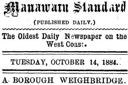 Manawatu Standard (PUBLISHED DAILY.) The Oldest Daily Newspaper on the West Coast. TUESDAY, OCTOBER 14, 1884. A BOROUGH WEIGHBRIDGE.