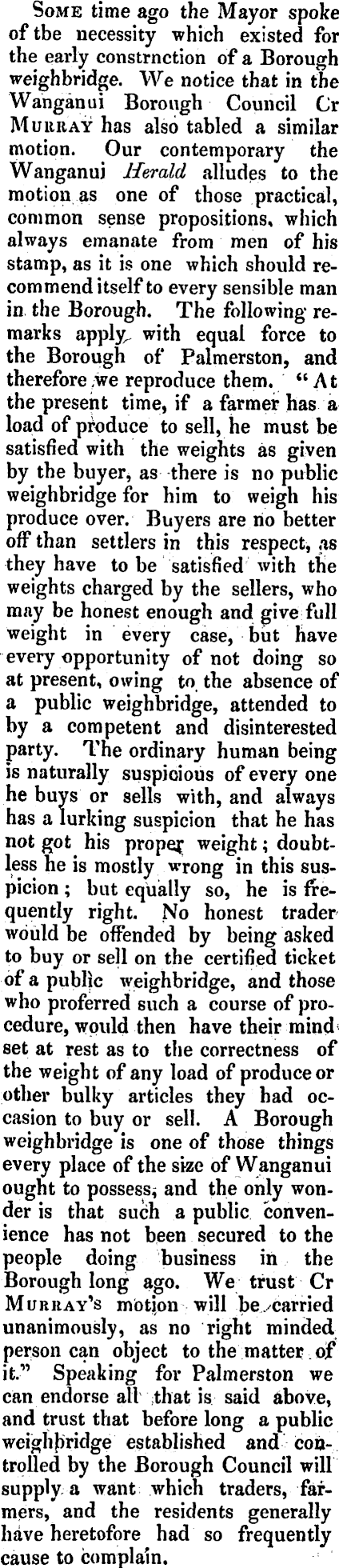 Some time ago the Mayor spoke of tbe necessity which existed for the early constrnction of a Borough weighbridge. We notice that m the Wanganui Borough Council Cr Murray has also tabled a similar motion. Our contemporary the Wanganui Herald alludes to the motion as one of those practical, common sense propositions, which always emanate from men of his stamp, as it is one which should recommend itself to every sensible man m the Borough. The following remarks apply, with equal force to the Borough of Palmerston, and therefore, we reproduce them. "At the present time, if a farmer has a load of produce to sell, he must be satisfied with the weights as given by the buyer, as there is no public weighbridge for him to weigh his produce over. Buyers are no better off than settlers m this respect^ as they have to be satisfied with the weights charged by the sellers, who may be honest enough and give full weight m every case, but have every opportunity of not doing so at present, owing to the absence of a public weighbridge, attended to by a competent and disinterested party. The ordinary human being is naturally suspicious of every one he buys or sells with, and always has a lurking suspicion that he has not got his prope^ weight ; doubtless he is mostly wrong m this suspicion ; but equally so, he is frequently right. No honest trader would be offended by being asked to buy or sell on the certified ticket of a public weighbridge, and those who preferred such a course of procedure, would then have their mind' set at rest as to the correctness of the weight of any load of produce or other bulky articles they had occasion to buy or sell. A Borough weighbridge is one of those things every place of the size of Wanganui ought to possess, and the only wonder is that such a public convenience has not been secured to the people doing business m the Borough long ago. We trust Cr Murray's motion will bevcarried unanimously, as no right minded person can object to the matter of it." Speaking for Palmerston we can endorse all ;that is said above, and trust that before long a public weighbridge established and controlled by the Borough Council will supply; a want which traders, farmers, and the residents generally have heretofore had so frequently cause to complain.
