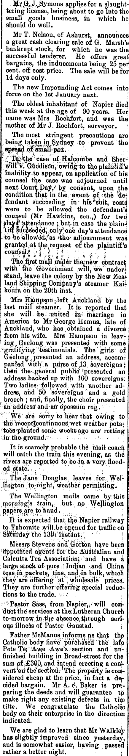 . Mi;.,G,,,J^Symonß applies for a slaughttering license, being about to go Into the small goods business, m which he should do well. Mr T. Nelson, of Ashurst, announces a great cash clearing sale of G. Marsh's bankrupt stock, for which he was the successful tenderer. He offers great; bargains, the inducements being 25 per cent, off cost price. The sale will be for 14 days only. i The new Impounding Act comes into force on the Ist January next. ! The oldest inhabitant of Napier died this webk at the age of 90 years. Her name was Mrs Rochfort, and was the mother of Mr J. Rochfort, surveyor. The most stringent precautions are being takeji r jn Sydney to prevent the , spread .oFsmall-ppx. './ £n::vthe ■■ case of Halcoinbe and Sherwiliy GoddiaOn, owifi^ to the plaintiffs inability -to appear, on application of bit counsel the case was adjourned until next GourtPay/ by consent, upon Jthe condition {hat m. the- erent of f the dej f endant succeeding m • his ''suit, costs were to be allowed the defendant's counsel (Mr Hawkins, seu.,) for tw6 fiaV|' jbutin case the plaint tiff f uccee^ejd, day's attendance to be yiow^^as 'the adjournment was grante/i^at the, request of the .plaintiffs couflsel.s .'I I vf • '• ■ • * ' ; : The^first toajl under theinew d)ntract with the Government will, we under-i stand, leave the colony by the New Zealand Shipping Conipany'B steamer Kaif koura on the 20th tfist. Mrs HaiWpsph^left Auckland by the last mail steamer. It is reported thaj; she will be united m marriage iq America to Mr George Hemus, late of Auckland, who has .obtained a divorce from his wife. Mrs Harapson m leaving^Greelong was presented with some '■■gratifying' "testimonials. The girls of Ge'elong presented an address, accomr panted 'with a purse of ,13 sovereigns ; tl»*ri the^gfeneral public" 'presented an address backed up with 100 sovereigns: Two ladies;, followed with another ad-: drew, and 50 sovereigns and a gold r brooch ; and, finally, the choir presented : an address and an opossum rug. : "■ 'We are' sorry to hear that owing to 'the recentjcontiniious wet weather pota: 'toes planted some weeks ago are' rotting Jnthe groundi" ; ,i .-.■..: ■•..i '■ It is scarcely probable the 1 hKail coach will catch tlio train this evening, as the rivers are reported to bo m. a- very, flooded stated, • . ' ' '■'■ ■••.;■■ ;:i'" :: -. .'i . '■ .-.■■,■•,■■• . . The ( Jane Douglas, leaves fforr r Wellington to-nigUt, weather permitting. The Wellington mails came by this morning's trflin, but no WeJHngton papers, are to hand. . It is expected that the; Napier railway to Tahoraite ,will,be opened for traffic on 'Sa^ui-day the 13th' instant.'; ' '; Messrs Stevens and' Gorton have been appointed agents for the Australian and Calcutta Tea Association; and have 4 ; large stpCfc 'Qf^ure [Indian ,and Chin^i teas -in^ackets,, tins, and t in bulk, which 1 "they are ofFering at J wiiolesaie 1 prices. They are further offering special reductions to the trade. •> r , ; v ''Pa?tor Sass, from Napier,, 1 will cori- [ duct the services at the Lutheran Church to-morrow, in tl)e absence, .through seriou,s illness of Pastor Gaustad. j Father McManus informs ns that thp Catholic body have purchased the late Pete Te; Awe -Awe's . section and unfinished building m Broad-street for the sum of; £300, and intend erecting a conivent^ori^he'scctioArThb property is considered cheap at the price, m fact a decided bargain. Mr A. c 3. Baker is preparing the deeds and will guarantee to . make right any existing defects m the tilte. We congratulate the Catholic body on their enterprise m the direction indicated. We are glad to learn that Mr Walkley has slightly improved since yesterday, and is somewhat easier, having passed rather a better night. ;