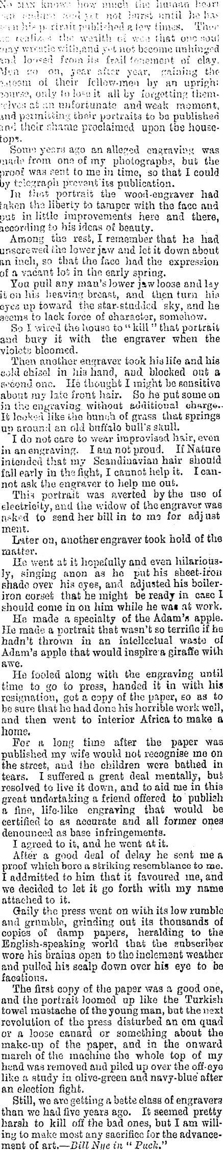 >,"•.> man Uii's'.v." isci-.v much Lin; iiiiuian ho-j-ri • ■••;> ;-r!-.];i:^ :<.>:<\y.T. not !:>7rsi, • : n i t i !ss h.v -.•■i ii hi.- i). riv.iit y! i ib! ; .--ho(l p. tew tiim:.s. Tiv.T ..c r.c.'ili /■.-••. t.i'.i? ',voilt,!i (■■: we.; that one :;oiiS fifty ww.-itic v.-iUi.ftnd .V"t not become imhin^r-d ",n;l 10->«sd from iis frail f^riement of clay. Mvn '.'•) on, t yora' r.i'trr yc-Ar, raining the-•r-tosm ot their fellow-men by an uprigh; •?ouv.--,0, only iDlo-iiit nil by ioi'gotUn.f! ihem■;hv.'; s.t ;ir> unfortunate and weak moment, and paimUfcin;;; tbe>r- portraits to bo published lin.'i their shame proclaimed upon lbs housetop*.. Som'i yor.ri) ago an alleged engraving was rnudv frnm ono of my photographs, but the proof wan sent to me m time, so that I could by telegraph prevsntits publication. In that portrait the wood -engraver had taken tha liberty to tampor with the face and put m Httlo improvements hero and there, according to his ideas of beauty. Among tha rest, I remember that he had unscrewed ths lower j&w and let it down about an inch, so that Lho face had the expression of a vacant 105 m tho early spring. You pull any man's lower jaw loose andlsy ii on hia heaving breast, and then turn lib eyes up toward the star-studded sky, and he seems to lack force of character, somehow. So 1 -.viioil tho Uouhg to " kill " that portrait and bury it with the engraver when the violet;; bloomed. Then another engraves took hialife and his noltX chisel m Jiia hand, and blocked out a :vcon<! ono. He thought I might ho sensitive about my laic front hair. So ha put some on m tho engraving, without additional chargeIs look-;-;! like the hnmjh of grass that springa up around an old buffalo bull's skull. I do not care to v/ear improvised hair, even man engraving. lam not proud. If Nature intended that ray Scandinavian hair should fall early iv ths fight, I cannot help it. I cannot ask the engraver to help me out. Thin portrait was averted by the use ol electricity, and the widow oi the engraver was n*k*d to send her bill m to mo for adj ust ment. Lnter oa, another engraver took hold of the matter. He went at it hopefully and even hilariously, singing anon as he put his sheet-iron shade over his eyes, and adjusted his boileriron coryef; that he might be ready m case I should come m ou him while ha wa« afc work. Ha made a specialty of the Adam's apple. He made a portrait that wasn't so terrific if he hadn't thrown m an intellectual waste of Adam's apple that would inspirea giraffe with awe. He fooled along with the engraving until time to go to proas, handed it m with his resignation, got a copy of the paper, co as to be sure that ho had dons his horrible work well, and then went to interior Africa to make a home. For a long tims after the paper was published my wife would not recognise me on the street, and iho children were bathed m tears. I suffered a great deal mentally, but resolved to live it down, and to aid me m this great undertaking a friend offered to publish a line, life-like engraving that would be certified to as accurate and all former ones denounced as base infringements. I agreed to it, and he went at it. After a good deal of delay he sent me a proof which boro a, striking resemblance to me. I addraiited to him that it favoured me, and we decided to let it go forth with my name attached to it. Gaily the press went on with its low rumble and grn.mblfl, grinding out its thousands of copies of damp papers, heralding to the English-speaking world that the subscriber wore his brains opan to tho inclement weather and pulled his scalp down over his eye to be facafcious. The first copy of the pap9r was a good ope, and the portrait loomed up like the Turkish towel mustache of the young man, but the next .revolution of the press disturbed an em quad or a loose canard or something about the make-up of the paper, and m the onward march of the machine the whole top of my head was removed and piled up over the off- eye like a study m olive-green and navy-blue after an election fight. Still, we aro getting a bette class of engravers than we had five years ago. It seemed pretty harah to kill off the bad ones, but I am willing to make most any sacrifice for the advancement of art. — Dill Nye m " Puck."