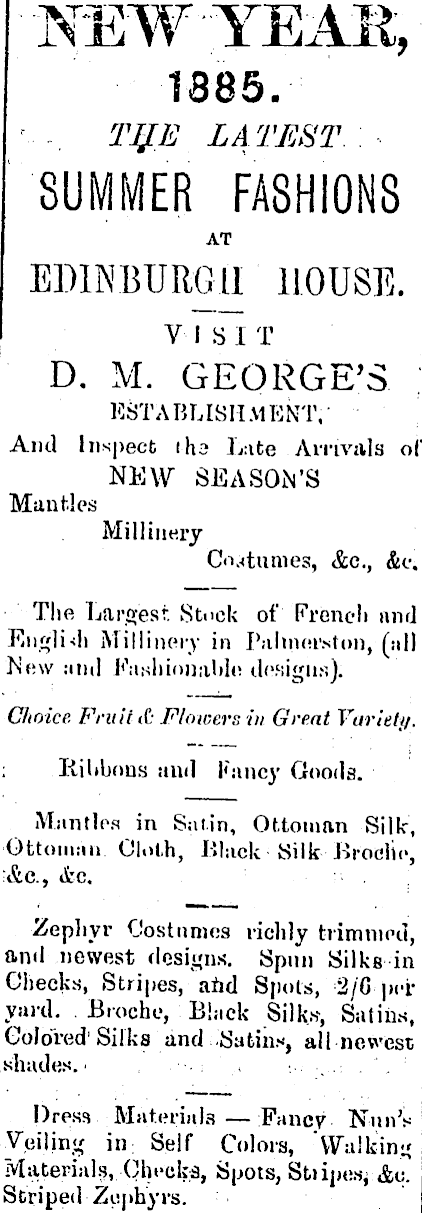 NEWTEAIV 1885. '■ -. TIfE LATEST. . SUMMER FASHIONS AT EDINBURGH HOUSE. VISIT D. M. GEORGE'S ESTABLISHMENT,And Inspect iha Late Arrivals of NEW SEASON'S Mantles Millinery C^tumes, &c, &c\ The Largest Stuck of French and English Millinery m Pahnerxton, (sill >ie.w and Fashionable designs). Choice. Fruit & Flowers m Great Variety. : Ribbons and Kancy Goods. Mantles m Satin, Ottoman Sillc, Ottoniiin Cloth, Black Silk -Br'oenc, ;&c, &c. ■■■•. . Zephyr Costumes richly trimmed, and newest designs. Spun Silks m Checks, Stripes, and Spots, 2/G peiyard. Brochc, Black Silk*, Satins, Colored 1 Silks and Safcins, all newest shades. ■ , . . . Dress Materials — Fancy Nun's Veiling m: Self Colors, 'Walking Materials, Checks, Spots, Stiipe.^ &c. Striped Zephyrs.