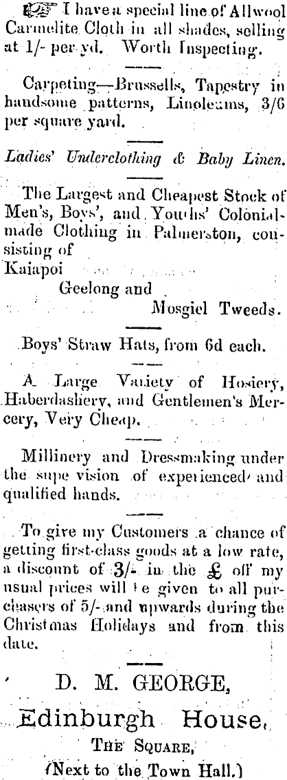 I have a special line pf A Ihvoql Carmelite Cloth m all shades, selling at 1/- per yd. Worth rnspecti»»\ Carpeting— Brussel ls, Tapestry m handsome patterns, Linoleums, 3/G per square yard. Ladies' Underclothing & Baby Linen. The Largest and Cheapest Stock of Men's, Boys', aud.You.ihs' Colonialmade Clothing m Palmer^ton, cousiscinir of Kaiapoi ■■■■.-. , . ; • Geelong and : . . . Mosgiel Tweeds. Boys' Straw Hats, from 6d each. A. Large Variety of Hosiery, Haberflasliery, and Gentlemen's Mercery, Very Chert]). Millinery and Dressmaking under the .supe vision of expeiienced' and qualified hands. . To give my Customers .a chance of getting first-class goods at a low rate, a discpunt of 3/- i" the £ olf my usual prices will * c given to all purchasers of 5/-; and tipwards during the Christmas Holidays and from this dale. ; D. M. GEOKGE, House,! The' Square/ /^ext to the Town Hall/1