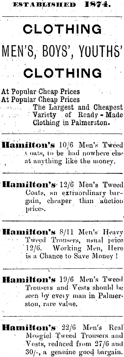 ESTABLISHED 1974. CLOTHING MEN'S, BOYS', YOUTHS' CLOTHING At Popular Cheap Prices . At Popular Cheap Prices -.. The Largest and Cheapest , . ■.;■••. "Variety of Ready -Made Clothing m Palmerston. Hamilton \<-i 10/6 Men's Tweed ...... \. <m.t.s, to be had nowhere els« i at anything like the money. Hamilton's' 12/6 Men's Tweed Coats, hii extraordinary bargain, cheaper than auction prices. ' \ \ t IlaiEliltoirs 8/11 Men's Heavy '■■■'' ■ Tweed Trousers, usual piice 12/ G. Working Men, litre is a Chance to Save Money ! Hamilton* 19/6 Men's Tweed Trousers and Vests should be seen by^ eveiy man m Pahuerston, rare", value. Haiti ilton's 22/6 Men's Real' Mos«iel Tweed Trousers and •Vests, red heed from 27/G and 30/-, a genuine good bargain.