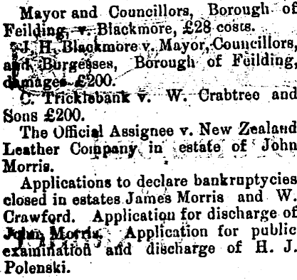 Mayor and CouncHlow, Borough of FeilduwK^Blacicinore, £28 j costs. ... f*Jfe3%kmbrev.,Maybr;!Coui|cillorß, alK^Burge^aes, Borough of Feilding, sS&bi^oo/^ .i : - L - ; W.<3rabtreo and Sons £200. The Official Assignee v. New Z«alaHd Leather Coijppojhy( m i.«*t»M ?| ? /^ n! ? Morris. ."■"'.' Applications to declare bankrnptycies closed m estates James Morris and W. Crawford. Application for discharge of Jutailfctfrte Application for public e AMMtoft^ idd discfiarge of H. J. Polenslii.