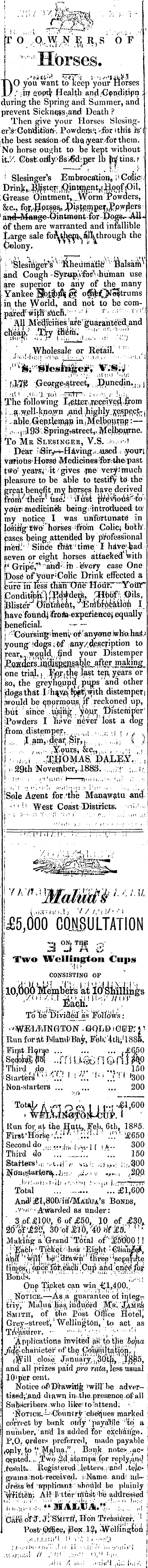 jr o o^s o f I ■ >v " ; Horses. rvO you want to keep your Horses 1/ .' :iiT £PPl4' Peiilth: and/Gpoditipn ; during the Spring and Summer, and prevent Sickness Death? Then give your Horses Slesinger>:GohtiLti'arth Powder^; -for (this is'! the best seasonof th.Q<year>forthem. No horse ought to be kept without it.'/. €Jbsb:oriiy;'Bsv6dfpjer lb jn/tins.f * 5 , ■ ; i ; ■ ■', i Si. - ' ! Slesinger's Embrocation, \) Gd&v Drink^^sterr^^ntanjentyi^oqfiOil, Grease Ointment,^. Worm Powders, a»4-M«Hge-Oifltmentfor Dogs^-Ail--6f them are warranted and infallible Large sale forWwmvfti\through the polony. ■vm.l** i ;^leßTiigeW A:^heiihiaii^.' v Salßatf and Cough -Syxtq^Yibr^human use ire superior to any of the many . Yankee B>jg>js % os>GJwf trums m the World, and not to be compj&ecfwp sticH. " •; -■ ' r. ;.:•:•;. r,V. t All Meditin'es ! arV guarante'ed^and r Wholesale or Retail. !! .;!■»;-.{. f.nn =>•!■•)« ■, i •--.;■•■•, i.-i ,- ■•■■:..•!.! ': ?)]#£ !Greorge-§treet r ; .Dunetjlin. . H • j The following L^,tJ;ev.,repeiyeft#om i i ..a,wpll-knp,wn ,and i . able.&entieinaia iii,|klclt>pp^ft : — | i>. . . jtJ93 •. Spring^street,. JVlelbpMrne. To Mr Slesinger, V.S. .;•■ ft Dear iSiry^-Having^.-used ■-, >youri various 1 Horsd Medicines ?for .the past two 1 years,; it gives .jne ••veryJhiuch pleasure to be able to testify io" the great benefit my horses have derived from^their'- use. 1 ■ llist iJre^ousW yduT' 1 medibinfe beihg^introdiuced to; my notice I was unfortunate" m jd§i%«lv6 ? 'ho:rses "fifb'm Colic; bolh' jjases being attended by professional jn'eiii' ■ Siiide tfeftt^titne I have' bad or eight horses atiaeked with f' Gripe,^- ati^ m Mwety case One JDosd of your i Colic Drink effected a buHH-RffliliaT^^ Conditebr^fK^defe, 3fl)ffAOilß, jßlister J .Orrfftteis, *^nt^Wldi .I_ have fouiidi IrOto-expeiieacei equally jbeneficial. — — j of anyone iwhaha^j young" (dogs ; of rany/.&scription to rear,, 3 .]wp i uTd i .. l^nd your Distemper one triaj,( J^i-j the last tcp, years or jso, the greyhojup^ yugs "and other jdbgs that . I, 1 h^viEL ipf s with distemper} iwould be e^nprmouSj if .reckoned up, ibut since upihg:. yo^r . iDi'stemtr'er' iPowders I h' yve never ' lost a nog jftom, distemper, ; , , : . >; . f {,r | iS .. Jamyjkar;.^,...^: ... i; \ g \ ....... „.:. ;XOUr,S, &C,,.,.; t ..,<:; '„, - I : .-> it ..\ ...t^omas; ©AW?y. T; :. > \ i-. 29th November,. 1883. .. !' :,,!.'. iSple Aeent for 'the Mana,watu and ■ • !l!l West Coast Districts. •.,-.: > ■"■'; '.<■'.■■■;'. 'C '■.'■' Vl '■'"' i ! ..' fi, ' ,:■'. :)>' .-;! ! ''■■' ' '.'•/." ■• ■ ' i ! ;:: ••*;■ :-' ' - ] . • »..': !'■] . I ;•. !«.■</... ; ;..:<.• ■ ~ j b^ffi'^ONSULTATION i -^ ON| TH|! ,-,• wrl J"H \tf I Tiro H^cllfington Cups j CONSISTING OP 1 10,<faS4 yrembefe at lO l^ iulliiiis ! To "fee "tei viAa^ka Eollows : I v/^jELiPJNG-TON" .fIQLD)GIH!P;r ' Run for at THlati^Bfiy, F^itlU'lSsl. i First 'Horse t^-%^ !Thin,l ,dp ... „. . 150 iataiAa'-V.^iv '•■■» l^.' |ii .;('«"'-^oo ; Mon-starters ... 200 ; Run for »it, the Hutl, Fe)). 6th, 18S5. •Firat'tfOTse'A: 17 *'-!:!?' 1 - .'.'.'" : 14650 ! Second do ' . {:tHv .f | A 300 Third do ... .._;.. "... 150 . Startfnsl.c •«t.4l r /.' Hiii; uj». ; ; ;il 3oo IVToutstarjlieif^. . i , . . .• ... , V ->.. , , ,SQQ Total" " .'„ '- J. ' '*. .'."ii-GOO Anft l '£l t BQWiTiW/titoA.'s Bonbs, •T flS ■■■■•■ A'w&rded as under: '.: 3. 0f, £100. 6 of j£so, JO of .£3O. so'offio/ioo'fjes:' Oi Making a 'Grand "Total of' WOO ! ! fafclr' Ticfeel -hrfS' Eight •^iiiuM, ■ * Ayilt" *»£'! f iliree ; l sepaf i/te tinj^j p^ice [for, ea^'fi '.'Cii^ and qnifie^ for Bonils. .. ""*" " '";_,■....;! One Ticket can wia .. Notice, — A.s.. a guarantee of iqteg■Bi'iyj' 'Maluft'.iias ) mducp<J .M^r. 'J^mk^ Smith, of iblin Post Office fiotel^ G-rev-street I , ' "v7eiiin^t6ri, : ' to act as Ti^a'silter. ••■ l '. '.:'"• : ''/, '!'' ; " f ' Applications invite*! ffitp iKbhcfoa j^l^chai-acter of the (^OT^uj^t^on. .' f^, 7 ill ; close Jatiuary^ j s6'tijb,. jl^feo, and all prizes paid pro rata, less usual 10 'pet cent. Notice of'Drawdtil; 'will' be advertised/^ixd dtawq iiv thepEesence ,of all Sn^cribers who like 1 tola ttend; 'Notice. •— '-ObntwHr 'cheques' itiarked cort'fct by bunk otrfy ' payable i! tq a mmi ber, and Is added for ekch'ange. P,O. orders preferred, made payable j,only,J« V/^lua." , B-ink. notes., uc- ' q«;pt(}^.,,. ( Two |2(l,stnnips (or replvjixivl ! ,fCHult.i wWttei-tj./ond .t^jc- ! fjvairjs-not'rec'eivetU i; Name and; iiiW ; ■tl'f-Hfes'fef "Wpplißftnt'SihoiUd be plainly ~\Hit't6ti: Alf l l <'tter'm'uslt''h ; (i addressed ; Cti-e o'f-JT. jl'&tiiTii, H ; 6n Treku^ef. '; \ Post (JWfice, ißosc,l?j »Wcllina;tbn i .Ktt.Luit'l. '< i.. .!•# --'nO j ; J^.-IH- ';u r -' .! >(■ il • .•.!;'; V;' '•:. •y)i\'.i'i ■■ .U,J;u:;!: // .-»> i .•/..,?! <;.'< f-,-. !