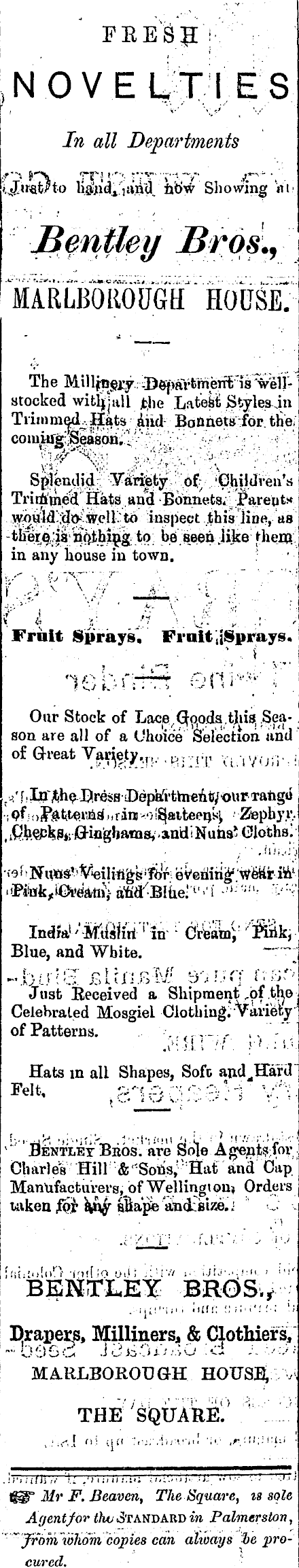,NOVEUXI ES In all Departments XjAts&H-o li,ajiid A .'itvntl^ nb!^ Showing «i t.■ Ifentleyi JBrad. y l ARLBOIOUGH ' HOi T S£; The MiH^ejry. .BefVarfemerftl^eijstocked witljjaU jfcbe Late&i; Styles jn TriinmedUH^ts; iiid Bonnet^ for tha coiu^^^aspri^"- •;:;■••'■ ' ' h'>--~ ■ '■■■ ■; ■*'. ' -■i^"^; "^, - •-; ; v ; - : " ■''■, ■■ *.;; m .\v: J'\---:l.--'- . -\ • . -■■■■ Spiendi^Lr -Fdnfety^ of, Trirtf^neq, Hats apd BonnetSil parents* -ihe^ia 'tt^bjna to be seeiu jike m any house m town. : fi ■ ii fi \ \J: : l v v Fruit Sprays'. Fruit jSprays. Our Stock of Lace^ooda.tJiis.Season are all of a Choice Selection and of Great Va^ety,,,, ,^ ]: , T Vl .; lVon . : ; t j.'f . Xp r^he-Bress sDepaTrthienfr/our xangii - pf joi^ttteuiidj.f in >o!^aitee^ ■ 2fepbyr. ii Q.feej3^p 4 .oioghftniß,.andiNuhssGlothß! ; ' ■ Jiuj'y) <e<Tsi\mWieiMg&Ti)r. eVeEiing 1 'Weiir M i'Fiiuk^i€Ji'e !^a < n'a<Bluer tl ''i -' ij;;!^ r; -' : -< Blue, and White. ""*"■"'' -JbtylS: jsUxibM 9or.;rf tu*r> Just Eeceived a Shipment r ipf .ttye Celebrated Mosgiel Cloth ing; Variefey of Patterns. ,,-, - .iMll.! ■/•/■. ?• '-■:».'. Hats m ail Shapes, Soft and^Hard [■;••■ tlJt*' •fi'-'if;!--, .'"■'A'-.'.tiw li.ij ■ I !!/.'. T. !-:■'.■ 1 Bentlet Bbos. are Sole A gents;lov Charles Hill '& 'Son's; 'Hat and Cap Manufacturers, of Welling»ou» Orders taken jfpi" sßape'aßd^ize.i ■■-• ■ ) [(iiil'l'.oD -i'tlfiO Oil! ; !V/ ;•■. ijfj-.'i!:!!. J i'!' BEKTLEY BROS.* Drapers, Milliners, & Clothiers, MA.RLBOROUGH HOUSi^ v THE 1 l^" Mr F. Beaven, The Square, is sole Agent/or thvSrAKVARvin Palmerston, "Jrobi whom copies can always %c procured.