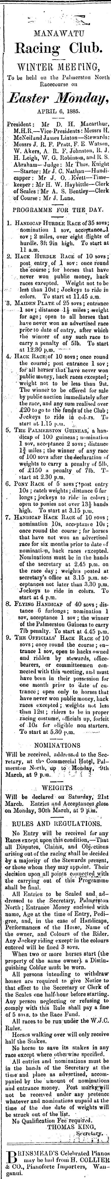 -" -■■ ■ : *f^ • MAIS T AWATU ! r Racing Club. » : WLNTER MEETING, ! To be held on tho Paluierstou North Racecourse on Easter Monday r 9 APRIL 6, 1885. ' President: Mr D. H. Macarthur, '■■ M.H.R.— VicePresiaents: Messrs 11. McNeil and James Linton — Stewards: ■ ' Messrs J. R. F. Pratt, F. E. Watson, W. Akers, A. R. F. Johnston, tt. J. H. Leigh, W. G. Robinson, ami R. S. : Abraham— Judge : Mr Thus. Knight — Starter: Mr J. C. Nathan— Handicapper: Mr J. O. , Evett— Tiine- ' - keeper; Mr H. W. Haybittle— Clerk of Scales I Mr A. S. Bentley— -Clerk • of Course : Mr J. Lane. PROGRAMMB~I?OR THE DAY. 1. Handicap Hurdle Race of 35 soys; nomination 1 soy, acceptance*! . soy ; 2 miles, over eight flights of hurdle. 3ft 9in high. To sturt at j 11 a.m. 2. Hack Hurdle Race of 10 soys ; post entry #of JL soy : once round the course ; for horses that have .never won public money, hack races excepted. Weight not to be • ■ lesS than lOst; Jockeys to ride m colors. To start at 11.45 a.m. 1 3. Maiden Plate of 25 soys ; entrance . ■:■■■ 1 soy ; distance 1 1 miles ; -weight for age; open to all horses that have never won an advertised race prior to date of entry, after which the winner of any such race to carry a penalty of 51b. To start at 12:30 p.m. — ' 4. Hack RACE;of 10 soys ; once round the courses ; post entrance 1 soy ; "-.._ for all horses" thafhave never won public money, hack races excepted; ' weight not to be less- than 9st. The winner to be offered for sale • .. ' by public auction immediately after the race, and any sum realised over . to go to th'e funds of the Club ; Jockeys to ride m colors. To start at 1.15 .p.m. '•. 5. The Palmkrston Guineas,' a han« dicap of 100 guineas ; nomiiisition 1 soy, acceptance 2 soys ; distance If miles ; the winner of any race of 100 soys after the declaration of weights to carry a penalty of 51h. of' £150 ii peualty of 71b. T-. start at 2.30 p.m. 6. Pony Race of 5 ' sovs'^fpost entry 10s ; catch weights ; distance 6 fur longs ; jockeys to ride m colors; open to ponies not over 13^ hands high. To start at 3.15 p.m. 7. Handicap Hack Race of 10 soys ; nomination 10s, acceptaiu c 10s ; once round the course ; for horses that have not won an advertised race for six months prior to date <f nomination, hack races excepted. Nominations must be m the hauds of the secretary at 2.45 p.m. on the race day ; weights posted at secretary's office at 3.15 p.m. acceptances not later than 3.30 p.m. Jockeys to ride m colors. To start at 4 p.m. 8. Flying Handicap of 40 soys ; distance G furlongs; nomination 1 soy, acceptance 1 soy ; the winner of the Palmerston Guineas to carry 71b penalty. To start at 4.45 p.m. 9. The Officials' Hack Race of 10 soys ; once round the course ; entrance 1 soy, open to hacks owned and ridden by stewards, officebearers, or committeemen connected with this meeting, and must have been m their possession for one month prior to date of entrance ; open only to horses that have never won public money, hack races excepted ; weights not less tlmn 12st; riders tv he m proper racing costume', officials up, forfeit of 10s for eligible nou starters. To start at 5.30 p.m. — NOMINATIONS Will be received, addressed to the Secretary, at th" Commercial Hot£l, Palmerston North, up to :Mondav, - 9th March, at 9 p.m. ' .*J i 1 >. WEIGHTS ..,; Will be declared on Saturday, 21st March. Entries and Acceptances ilose on Monday, 30th March, at 9 pYnu RULES AND REGULATIONS! No Entry will be received for any Baces except upon this condition, — Time nil Disputes, Clairiyg, and 'Objections arising out of the racing shall he decided iy a majority of the Stewards present, or those whom they may appoint. Their .•decision upon all points cuiijiected^witli the carrying out of this Programme shall be final. All Entries to be Sealed and. addressed to the Secretaryj Pulmefsfou North ; Entrance Money enclosed with name, Age at the time of Entry, Pedigree, and, m the case of Handicaps, Performances of tho Hoise, Name of the owner, and Colours of the Rider, j Any Jockey riding except* hi the colours , entered will be fined 3 soys. j When two or more horses start (the j property of the same owner), a Distinguishing Colour mu^t be worn. All persons intending to withdraw hoises are required to give Notice to that effect to the Secretary or Clerk of the Scales one half-hour before starting. Any person neglecting or refusing to with this Rule shall pay a fine of 5 soys. to the Race Fund. All races to be run under, the W.J.C. Rules. Horses walking over will only receive half the Stakes. No horse to save its stakes m any race except where otherwise specified. All entries and nominations must be m the bands of the Secretary at the time and place as advertised, accompanied by the amount of nominations and entrance money. Post ina'rfefqyill not be received under auy pretence whatever and nominations unpaid at the time of the due date of weights will be struck out of the list. - . No Qualification Fee" required . THOMAS KING, , , S,<'cretu^y. .^ : "_ ';- ■: f"1 M *"i v i BRISSMKAD'S Celebrated Pianos may be hud from H. COLLIER & CO., Pianoforte Importers, Wauganui.