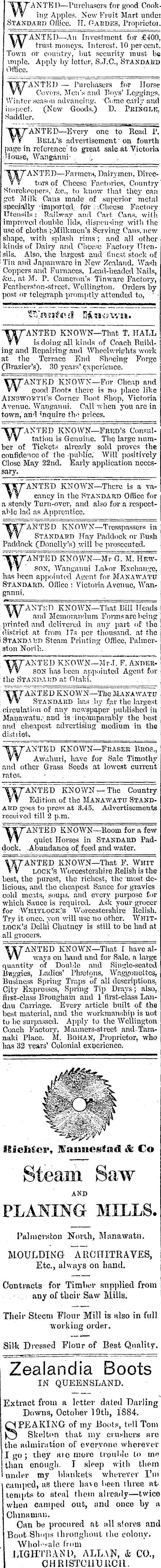 WANTED — Purchasers for good Cooking Apples. New Fruit Mart under Staxdard Ofiicc. TT. T-abdes, Proprietoi. WANTED— An Investment for £400, trust moneys. Interest. 10 percent. Town or country, but security must be vmple. Apply by letter. S.J.C., STANDAIiD Office. WANTED — Purchasers for Jlorse Covf.-rs, Men's and Tsoys' Letrgingf. Winter season advancing. Ccmo early and inspect. (New Goods.) D. PiiIKGLE, Saddler. WANTED— Eveiy one to Rcad~p! Bell's advertisement' on fourth page m reference to .great sale at Victoria House, Wanganni- . -X WANTED— Farmer*, Dairymen. Directors of Cheese Factories. Country ' Storekeepers," &c., to know that they can tret Milk Cans made of superior metal specially ;unpojted; for ?-. Cheese Factory Utensils ; Rs.tbr.ay n,n:l Cart Cans, with improved double lids, dispensing with the use of cloths ;-Milkmeu's Serving Cans, new shape, with splash rims ; and all other kinds of Daily and. Cheese Factory Utensils. Also, the largest and finest stock of Tin and Japanwarc m New Zealand, Wash Coppers and Furnaces, Lead-headed Nails, &c, at SI". P. Cameron's Tinware Factory, Fcfithcrston-strcct. Wellington. Orders by post or telegraph promptly attended to, ' ■ fS'a sate £l M 3? a xvn . "TTTANTED KNOWN— That T. HALL 7 t is doing all kinds of Coach Building and Repairing and Wheelwrights work at the Terrace End Shoeing Forge (Brazier's). 30 years' experience. j WaWkD KNOTVN— "For" Cheap and good Boots there is no place like AlNSWOvnrs Corner Boot Shop. Victoria Avenue. Wanganui. Call when J'ou are m town, aril inquire 'tho prices. WANTED KNOWN— FRKD'S Consultation is Genuine. The large number of Tickets already sold proves the confidence of the -public." Will positively Close May 22nd. Early application nccesj sary. "TTrANTED KNOWN— There is a vaV t cancy m the Standard Office for a steady Turn-over, and also for a respectable lad as Apprentice. "TSXANTED KNOWN— Trcsspassers m TV Standard Hay Paddock or Bush Paddock (Donelly's) will be prosecuted. KNO\VN— Mr G. M. HewT T SOX, Wanganui Lafcor Exchange, has been appointed Agent for MANAWATU Standard. Office : Victoria Avenue, Wanr ganui. WANT-.cD KNOWN— That Bill Heads and Memorandum Foras are being printed and delivered m any part of the district at from 17.s per thousand, at the Standai.-p Steam Printing Office, Palmerston Norih. ; WANTED KNOWN— Mr. T. F. AnderSON has been appointed Agent for the Sta>:)>ai:d at Otaki. . . -. "TT7 ANTED KNOWN— The Makawatu W Standard has by far the largest circulation of any newspaper published m Manawatu.- and is ihci>inparably the best and cheapest advertising 'medium m the di.st-1 iot. WANTED KNOWN— Fraser Bros., Awahuri, have for Sale Timothy and other Grass Seeds at lowest current raten. • . ANTED~KNOWN — The Country Edition of the Manawatu Standard goes to press at 3.45. Advertisements received till 2 p.m. "YTTANTED KNOWN— Room for a few wumf V T quiet Horses m Standard Paddock. Abundance of. feed and water. \XT ANTED KNOWN— That F. Whit ? v lock's Worcestershire Relish is the best, the purest, the richest, the most delicious, and the cheapest Sauce for gravies J cold meats, soups, and every purpose for which Sauce is required. Ask your grocer for ;\Vhitlo6k;s Worcestershire Relish. Try it once, yon will nse no other. Whitldck'3 Delhi Chutney is still to be had at ali grocers. ANTED KNOWN— That 1 have always on hand and for Sale, a large quantity of Double and Single-seated. Buggies, Ladies' Phaetons, Waggonettes. Business Spring Traps of ali descriptions. City Expresses, Spring Tip Drays; also,, iirst-class Brougham and 1 first-class Landau Carnage. Every article built of the best material, and the workmanship is not to be surpassed. Apply to the Wellington Coach Factory, Manners-street and Taranaki Place. M. Bohan, Proprietor, who lias 32 years' Colonial experience. ISbcMcb', lltannegftad & Co Steani Saw AND PLANING MILLS. Palmci'Kton North, Manawatn. MOULDING ARC ETITR A YES, Etc., always on hand. Contracts for TimW supplied from any of their Saw Mills. Their Stecm Flour Mill is »ilso m full working order. Silk Dressed Flour of Best Quality. Zealandia Boots IN QUEENSLAND. Extract from a letter dated Darling Downs, October 1 9th, 1884. SPEAKING of my -Boots, tdl Tom Skelton that my crushers are the admiration of everyone wherever I go ; they aic more irouMc U> oir than enough. T sleep with them under my l»h»ikets wherever I'm camped, as there ha\e lieen three at- ■ tempts to steal them already — twice . when camped out, and once by a China man . Can be procured at all stores and Boot Shops throughout ilie colony. Wholesale from I/EGHVBANI), ALLAN, & CO., CHRlSTClimiCii.