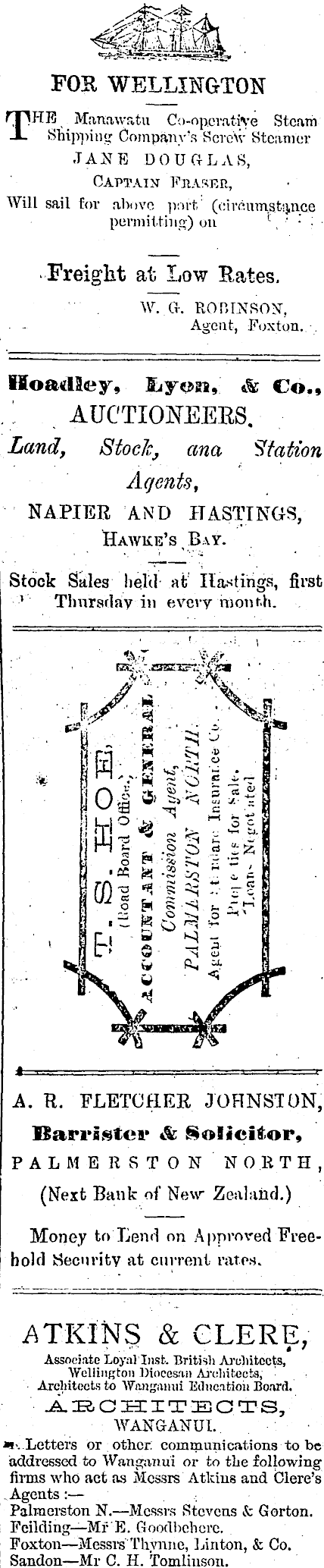 FOR WELLINGTON THE _ Manawatu Co-operative Steam ' Shijniiii'j: Company's Scro\v Steamer JANE DOUCtLAS, Captain Fearer, Will sail for above ]inrt, (i:ircnmgt}j,nce pennittinj?) on l , ■' • ■ ■ Freiglit at Low Rates. W..G. ROBINSON', Agent, Foxton. . IfioadSoy, iijr^n,! & Co., .' AUCTIONEERS. Land, Stock, ana Station Agents, NAPIER AND HASTINGS, llawke'sßay. Stock Skies held at Hastings, first ■•■'"' Thursday m every roont.h. . ..,!•■ ...;. \ --■ ■ . %'7 V rij g.■ §2 s ' •■A U-l f> 1 S - - rH v■u ■ ■.g o * t k ; ■ « to -2 ~c k ' -I? '2' 2 1 X A. R. FLETCfIER JOHNSTON, ISarristci* & Solicitor, PALMERSTON NO RT H , (Next Bank of Ne%\ r Zealand.) Money to Lend on A pproved Freebold Security at current rates. ATKINS & GLERE, Associate Loy.il lust. British ArcMtocts, Wellington Diocesan Architects,' Architects to AVongauui Eihicatioii Board. ABCHITECTS, WANGANUI. «>.. Letters or other; communications to be addressed to Wangmmi or to the following; fii-ms who act as Messrs Atlcins and Clere's : — ; Palmerston N. — Messrs Stevens & Gorton. Fcilding— Mr E. G-oodbehcrc. Foxton— Messrs Thynne, Linton, & Co. Sandon — Mr C. H. Tomliuson.