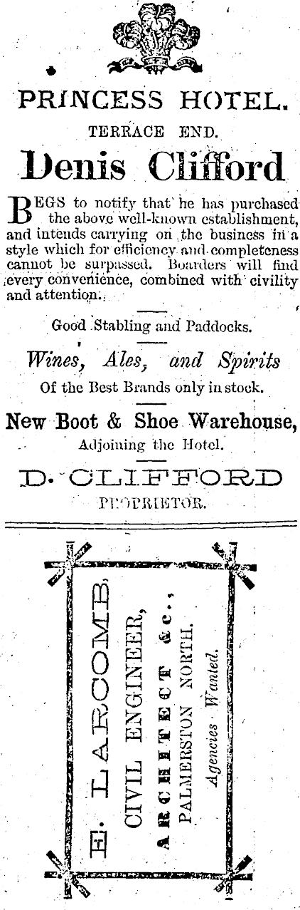 PRINCESS HOTEL. TERKACE END. Denis Clifford BEGS to notify that" he has purchased the above well-known establishment, and intends carrying on ; .the business iii a style which for efficiency and- completeness cannot be surpassed. Boarders will find .every convenience, combined with civility and attention:; Good Stabling and' Paddocks. Wines, Ales, mid Spirits Of the Best Brands only m stock. New Boot & Shoe Warehouse, Adjoining the Hotel. \ f\ H as is I; . . . ■■■•. o ■■■flj2.- -