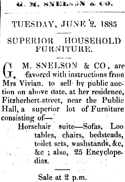 TUESDAY, JUNF/2. 1885 SUPERIOR HOUSEHOLD F URN ITU RE. GM. SNELSON & CO, are , favored with instructions from Mrs Vivian, to sell- by public auction on above date, at her residence, Fitzherbert-street, near the Public Hall, a superior lot of Furniture consisting of — ■ Horsehair suite — Sofas, Loo tables, chairs, bedsteads, toilet sets, washstands, &c, &c ; also, 25 Encyclopedias. — . : Sale at 2 p.m.