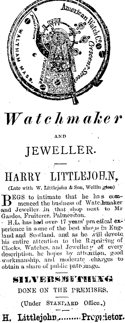 Watchmaker AND , JEWELLER. HAfiRY'LITTLEJORW, (Late with W. lattlejohn & Sou, Wellin gfo») ' BEGS to intimate that he has commenced the business of Watcihmaker and Jeweller- ,m thn,|: shop next to Mr Gardes. Fruiterer, Palmoivston. - H.L.has had over- 17 years' pra cSical ex.' '' perience m some of the best sho'js vi England and Scotland, aud as ha .vill devote, his entire attention to the Rq>runug of Clocks. Watches, and Jc-.vellcT y of every description, he hope? by attidnxwm, good . worlcinaiißhip. and moderate. -«ha;i'gcs to obtain a share of public patr< jungc. SIIiVJEBsS¥ r JTBI¥3!f« DONE ON THE PR3SMISBS. (Under STAxr,ABD Office ,) I H. Littlejolm,, Prcpj:ietor.