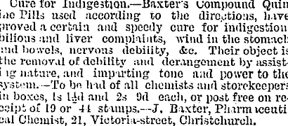 Cure for Indigestion. — Baxters compound Quin iiic Pills used according to the directions, h.vve proved a cor tain and speedy cure for indigestion, bilious and liver complaints, wind m the stomach and lxv.vols, nervous debility, &c. Their object is the removal of debility :md derangement by assisti lg nature, and importing tone and power to the system.-- To bn hul of all chemists and storekeepers m boxes, Is Ud and 2s 9d each, or post free on rccgiiJtot 19 or*4l stamps,- -J. Baxter, Phirimceuti cal Chemist, 21, Victoria-street, Christchuroli.