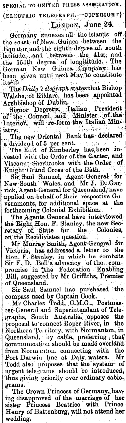 SPEOIaL TO UNITED PRESS ASStCUTtOK, (ELECTRIC TBLEaRAPH.— CDPTBIOHI')'-' LotJpoNv June2s. .! Germany annexes nU the islands' off the toast: of JHeyv. Guinea between the Equator. .and the -eighth- degree- of . .south latitude, .-anti .betweQD-..bh^,.4lajb; and [i\xa 154 th (iejjcee o? Ibnrtititudd. • The (German Now Guinoa jsiiupn,ay;. has been given until next May/to constitute "itSP,lfc :; .':. ■' '" •:• ••■■■■■ ■'• ' : ■"" - T-he Daily r i elegraph states that Bishop 'WaUheyrot Kttdarej. has been Appointed Archbishop of Dublin., r ■:.:■ . Sfghqr pep ; retisi;_4!#H an ., , President b?"the Council, att3.C Minister;, oil the ; Interior 1 , will re-form the .. Italian Miiu ; istry.. '.'..'■ '■".:'-.'..'■'" ■'Vv-.-'r.f-;'^' '_'■ /..The new Oriental Bank has declared a diyiciei.nl of 5 per cent. •— .^ • The.Eirl of Kimberley has; beett invested \viih the Order of the Garter, and Viscount Saerbrooke with the- Order of. Knight Grand Cross of the Bath. - : . Sir Saul Samuel, Agent-General • for Nevr South Wales, and Mr J. D. Gatrick, Agent-General for Queensland, have .'applied^on behalf of their respective Governments, for additional space at the forthcoming Colonial Exhibition. ...-■' The Agents General have inter vie wedthe Eight Hon. F. Stanley, the new Sefc--l'etar^ of. State for, the .Coloniea, .on the Recidivistes question. " - Mr liurray Smith,^Agent-General f6rVictoria, has addressed a letter to the Hon. F. Stanley, m vrhich he combats Sir F. D. BoU'r advocacy of the compromise m *the Federation Enabling Bill, suggested by Mr Griffiths, Premier of .Queensland. . Sir Saul Samuel has-' purchased -'-the compass used by Captain Cook. . . Mr Charles Todd, C.M.G., Postmas-ter-General and Superintendant of Telegraphs, South Australia, opposes the proposal to connect Roper River, m the Northern Territory, with Kormanton, m . Queensland, by cable, preferring ; that" cpmmunicatiou should be made overland from Norm.-i:iton, connecting with the Port Darwin line at Daly, waters. Mr Todd also i)ibposes that the system- of urgent telegrams should be introduced, thus giving priority over ordinary cable-; grams. ' The Crown Princess of Germany,hav r ing disapproved of the marriage of her siafar Princess Beatrice with Prince. Henry of Battenburg, will not attend her wedding. ,•■..