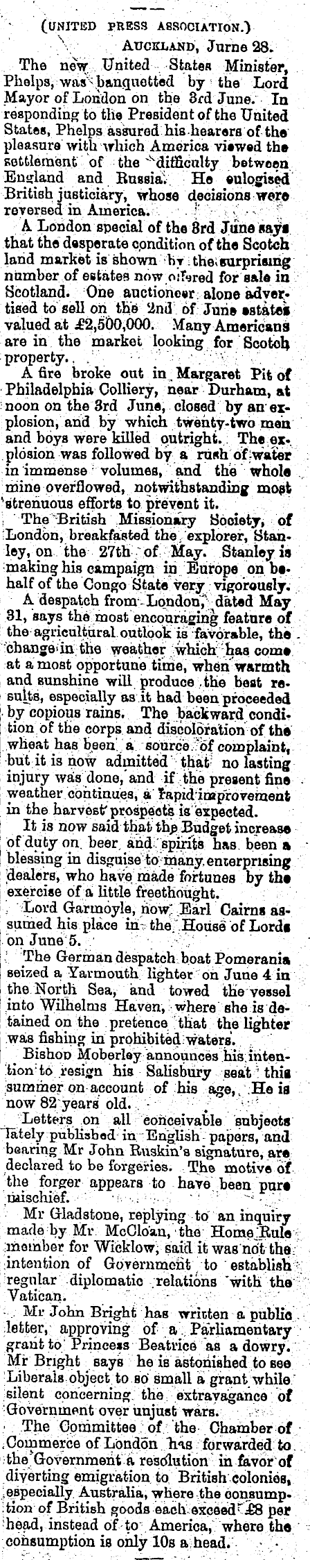 (UNITED PRESS ASSOCIATION.") \ Auckland, Jurne 28. The neyr United Stateß Minister, Phelps; was\banqnetted by ; the Lord Mayor of London on the 3rd June. In responding to the President of the United States, Phelps assured his hearers of the pleasure with which America viewed the settlement of the between England and Russia: Ho eulogised British justiciary, whose decisions wer© reversed m America. !' . •- A London special of the Brd Jiine Rays I that the desperate condition of the Scotch land market is shown hr the* surprising number of estates now oil Wed for sal* m Scotland. One auctioneer alone adyei> tised to sell on the 2nd of June •states valued at £2,500,000. Many Americans are m the market looking for Scotoh property.. A fire broke out m, Margaret Pit of ! Philadelphia Colliery, near Durham, at | noon on the 3rd June, closed by an exI plosion, and by which twenty-two man and boys were killed outright.; The ex. plosion was followed by a rush of fwater : m immense volumes, and the whole mine overflowed, notwithstanding most 'strenuous efforts to prevent it. ■ The' British .Missionary Society, of London, breakfasted the; explorer, Stan, ley, on the 27th ;of May. Stanley m making his campaign m Europe on behalf of the Congo State very vigorously. : A despatch from-London/; dated May 31, says the most encouraging feature of the agricultural outlook is favorable, the fchange>in the weathor come. at a most opportune time, when warmth and sunshine will produce .the beat results, especially as it had been proceeded by copious rains. The backward condition of the corps and Qwcblofa'tion of the wheat has been a source.?of complaint, but it is now admittedp that- no lasting injury was done,'and if tfie present fine • weathercontinues j a fapid'inaprdvement m the harvest prospects is expected. It is now said thjit the Budget increase of duty on beer, and.;spiril;B has. been a blessing m disguise to-many, enterprising 'dealers, who have made fortunes by the exercise of ai'little freethought. , ;Lord Garmoyle, riowjEarL Cairns assumed his place m- the.House of Lordi "on June 5. ■/• '■■''■ I The German despatch boat Pomerania seized a Yarmouth lighter oh June 4 iv the North Sea, and towed the vessel into Wilhelms Haven, -where' she is detained on the pretence 'that the lighter was fishing m prohibited Raters. Bishop Moberley announces bis;inten:tion" to resign his Salisbiiry seat^ thii •summer on account of his age fv ;He is now 82~years old.;"-' ' ; ;'-' Letters on all eohceivable subjeots "litelypublisbod in -English papers, and bearing Mr John Ruskin'a signature, are. declared to be forgeries. Th© motive of the forger appears to have been pure ;Biischief. ■ -v ••..:-;..;; " : -._;: Mr Gladstone, replying to an inquiry made by Mr McCloan, the HomejEule ■-■ ;nieinber for Wicklowi said it wasridt theintention of GoTernment to establish i;; regular diplomatic ;reUvti6hs "with the ; ;Vatican* / ""c ■■- ■ •'■-:' V; >;: ■■. ;-;-' [':■'■■ • . Mr John Bright has written a publia . letter, approving of a:; Parliamentary grant to' Princets Beatrice as a dowry. Mr Bright says he is astonished to see Liberals .object to so small a grant while; silent concerning the extrayagance of :Government over unjust wars. •■.:>?■-%; ■ The Committee \of the Chamber of Commerce of^^Lbndpn Vh<is.forwarded to. : the Government a resolution m favor'of diverting emigration to, British colonies, jeßpecially. Australia, where the consump:tion of British goods each- exceedQ-8 per head, instead of to America, where the consumptionia only 10sahead.