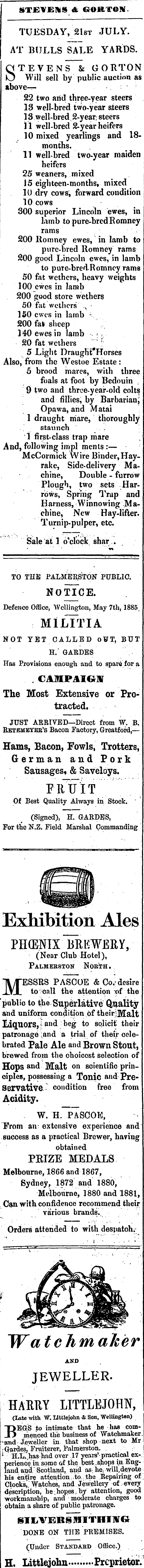 STJEVEHS A GOATON. TUESDAY, 21st JULY. AT BTJLLS SALE YARDS. STEVENS & GORTON Will sell by public auction as tbove-r- : 22 two arid three-year steers 13 well-bred two-year steers IS well-bred. 2-year; steers jl well-bred 2-year heifers 10 mixed yearlings and 18---months. 11 well-bred two-year maiden heifers 25 weaners, mixed 15 eighteen-months, mixed 10 dry cows, forward condition 10 cows 300 superior Lincoln ewes, m lamb to pure-bred Romney rams 200 Romney ewes, m lamb to pure-bred Romney rams 200 good Lincoln ewes, m lamb to pure-bred-Romncy rams 50 fat wethers, heavy weights 100 ewes m lamb 200 good store wiethers 50 f.it wethers' '\ 150 ewes m lamb ; 200 fat sheep 140 ewes m lamb : : . 20 fat wethers ■ 5 Light Draugbt*Horses Also, from the Westoe Estate : 5 brood mares, with three foals at foot by Bedouin 9 two and throe-year-old colts and fillies, by Barbarian j Opawa, and Matai 1 draught mare, thoroughly staunch , 1 first-class trap mare And, following impl ments : — McCormick Wire Binder, Hayrake, Side-delivery Machine, Double - furrow Plough, two sets Harrows, Spring Trap and Harness, Winnowing Machine, New Hay-lifter. Turnip-pulper, etc. Sale at 1 o'clock shar.. ■ ■■■-■ -• ■■ ■ ' -■■■;, i ■=■ TO THE PALMEESTON PUBLIC. NOTICE. Defence Office, Wellington, May 7th, 1885. MILITIA NOT YET CALLED o¥T, BUT H. GARDES Has Provisions enough and to spare for a . CAMPAIGN The Most Extensive or Protracted. JUST ARRIVED— Direct from W. B. Retemkyeb's Bacon Factory, Greatford,— Hams, Bacon, Fowls, Trotters, German and Fork Sausages, & Saveloys. Of Best Quality Always m. Stock. (Signed), H. GARDES, For the N.Z. Field Marshal Commanding Exhibition Ales PH(ENIX"MKWERY, (Near Club Hotel), Palmebßton North. MESSRS PASCOE & Co.? desire to ; call the attention of the "public to the Superlative Quality alnd uniform condition of theirjMalt , Hi(JUOrs,*and beg to solicit their patronage ;and a trial of tlieir celebrated Pale Ale and Brown Stout, brewed from the choicest selection of Hops and Malt on scientific prinoiples, possessing a Tonic and ; Preservative.- condition free from Acidity. W. H. PASCOE, From air extensive experience and success as a practical Brewer, having obtained PETZE MEDALS Melbourne, 1866 and 1867, Sydney, 1872 and 1880, Melbourne, 1880 and 1881, Can with confidence recommend their various brands.. V Orders attended to with desnatoh; Watchmaker AND JEWELLER. HARM LITTLEJOHN, (Late with Wl Littlejohn & Son, Wellington) EEGS p> intimate that he has commenced the business of Watchmaker, 'and; Jeweller m that shop next to Mr : (xardes, 'Fruiterer, Palmereton. ; 1 H.LVhas had over .17 years' practical ex-, perience m some of the best. shops m. England ani Scotland, and as. he. wiU^deyote his entire attention; to. the Repairing of ' Clocks,. Watches, and Jewellery of every description, he : hopes ; by attention, good ■workmanship, and moderate charges to obtain a share of public patronage. SIIiVEBsSITHMfG DONE ON THE PREMISES. (Under Standabd Office.) H. littl€aohn..».....Prcprietbif.