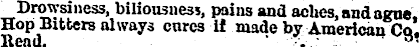 Drowsiness, biliousness, pains and aches, and ague. Hop Bitters always cures if made by American Cg ?