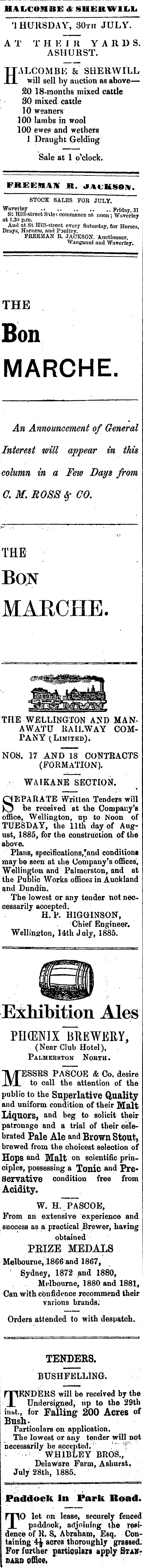 HAEiCOMBE: A SIIJGRWIUL UHURSDAY, 30th JULY. A T T HEIR YARDS. ASHURST. HALCOMBE & SHERWILL will sell by auction as above — 20 18-months mixed cattle 30 mixed, cattle 10 wsaners 100 lambs m wool 100 ewes and wethers 1 Draught Gelding Sale at 1 o'clock. FREEMU R. JAtHSOK. STOCK SALES FOR JULY. Wnyerley •* Friday, 31 St Hill-streot S-iIM commence at. noon ; Waverley at 1 .30 p.m. Auil at St Hill-street every Saturday, for Horses, Drays, Harness, and PauUrv. PUEEMAN It. .TACKSOX. Auctioneer, Wanffaiini and IVaYerley. THE Bon MARCHE. An Announcement of General Interest will appear m this column m a Few Days from CM. ROSS 6f CO. THE Bon MARCHE. THE WELLINGTON A3D MANAWATU RAILWAY COMPANY (Limited). NOB. 17 AND 18 CONTRACTS (FORMATION). WAIKANE SECTION. SEPARATE Written Tenders will be received at the Company's office, Wellington, up to Noon of TUESDAY, the 11th day of August, 1885, for the construction of the above. Plans, specifications,'and conditions may be seen at the Company's offices, Wellington and Palmers ton, and at the Public Works offices m Auckland and Dundin. The lowest or any tender not neccessarily accepted. H.P. HIGGINSON, Chief Engineer. Wellington, 14th July, 1885. Exhibition Ales phcenix "brewery, (Near Club Hotel), Palmerston North. MESSRS PASCOE & Co. desire to call the attention of the public to the Superlative Quality and uniform condition of their Malt Liquors, and beg to solicit their patronage and a trial of their celebrated Pale Ale and Brown Stout, brewed from the choicest selection of Hops and Malt on scientific principles, possessing a Tonic and Preservative condition free from Acidity. W. H. PASCOE, From an extensive experience and success as a practical Brewer, having obtained PEIZE MEDALS Melbourne, .1866 and 1867, : Sydney, 1872 and 1880, Melbourne, 1880 and 1881, Can with confidence recommend their various brands. Orders attended to with despatch. TENDERS. BUSHFELLING. npENDERS will be received by the X Undersigned, up to the 29th inbt, for Falling 200 Acres of Bush. Particulars on application. The lowest or any tender will not necessarily be accepted. : ''"?' WHIBLEY BROS., Delaware Farm, Ashurst. ; July 28th, 1885. PaddocK m Park Road. TO let on lease, securely fenced pnddook, adjoining the residence of X, S. Abraham, E6q. Containing 4£ acres thoroughly grassed. For further partioplar* apply Standard office,