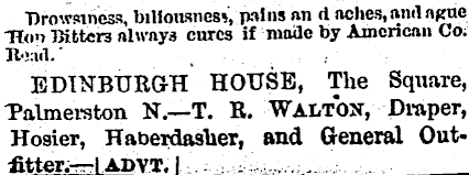 Drowsiness, billonsnesi, pains an d aches, ami ague TTou Bittcra always cnrcs if niMlc by Amencjin Co; II.j:m1. ' .•■... : : EDINBURaH HOUSE, The Square, Talmerston N.— T. B. WALTONy Draper, Hosier, Haberdaslier, and General Out-fitteK-r-|.ADYT. 1. 1. :■ ■: J;,.,,,.,.;.^..,;.. ,■ .. . -