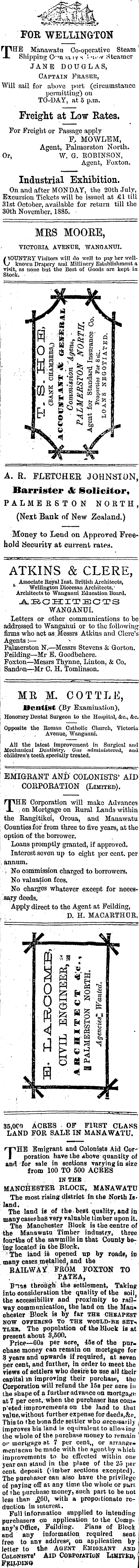 FOR WELLINGTON — — — • i rriHE Mjinawatu Co-operative Steam JL Shipping C^'a laiys '■ 'n>v Steamer JANE DOUGLAS, Captain Frasbe, Will sail for above port (circumstance peraiitthig) ou TO-DAY, at 5 p.m. Freight at Low Rates, For Freight or Passage apply F, MOWLEM, Agent, Palmerston North, Or, W. G. KOBINSON, Agent, Foxton. Industrial Exhibition. On and after MONDAY, the 20th July, Excursion Tickets will be issued at £1 till 31st October, available for return till the 30th November, 1885. MES MOOEE, VICTORIA AVENUE, WANOANUI. CIOUNTRY Visitors will do well to p.iy licr well- ) known Drapery and Millinery Establishment a visit, as none but the Best of Goods are kept m Stock. O|l 111, -5 • <m .« &j q § jz § -I &* A. R. FLETCHER JOHNSTON, Barrister & Solicitor, PALMERSTON NORTH, (Next Bank of New Zealand.) Money to Lend on Approved Freehold .Security at current rates. ATKINS & CLERE, Associate Royal Inst. British Architects, Wellington Diocesan Architects.' Architects to Wanganui Education Board. ABGHITECTS WANGANUI. Letters or other communications to be addressed to Wanganui or to the following firms who act as; Messrs Atkins and Clcre's Agents : — Palmerston N.— Messrs Stevens & Gorton. Feilding— -Mr B. Goodbehere. Foxton— Messrs Thynne, Linton, & Co. Sandon— Mr C. H. Tomlinson. ME M. COTTLE, If Ciitist (By Examination), Honorary Dental Surgeon to the Hospital, &c., &c. Opposite the Roman Catholic Church, Victoria . Avenue, Wanganui; All the latest improvement m Surgical and Mechanical Dentistry, G-.vs administered, aud children's teeth specially treated. EMIGRANT AND" COLONISTS' AID CORPORATION (Limited). fTIHE Corporation will make Advances JL on Mortgage on Eural Lands within the Kangitikei, Oroua, and Manawatu Counties for from three to five years, at the option of the borrower. Loans promptly granted, if approved. Interest seven up to eight per cent, per , annum. t No commission charged to borrowers. No valuation fees. No charges whatever except for necessary deeds. Apply direct to the Agent at Feilding, ; D. H. MACARTHDR. fl) ii : x Bis a I 2 « *■& 1 3 ess* H *"" 35.0C0 ACRES OF FITiST CLASS LAND FOR SALE IN MANAWATU. THE Emigrant and Colonists Aid Corporation have the above quantity of and for sale m sections varying iv size from 100 TO 500 ACRES INTHB MANCHESTER BLOCK, MANAWATU The most rising district m the North Is> land. ■■■■■-. The land is of the best quality, and m many caseshas very valuable timber upon it. Tbe Manchester Block is the centre of the Manawatu Timber industry, three fourths of the sawmills m that County being located m the Block, J The land is opened up by roads, m many cases metalled, and the RAILWAY FROM FOXTON TO ■ PATMA, B*vas through' the settlement, Taking into consideration the quality of the soilj the accessibility and proximity to railway communication, the land on the Man* obester Block ia by far thk cheapest NOW OFFEB£NG TO THB WOULD-BB SETi TLER. The population of the Block is at present about 3,500. Price— 6os per acre, 45s of the purchase money can remain on mortgage for 3 years and upwards if required, at seven per cent, and further, m order to meet the views of settlers who desire to use all their capital m improving their purchase, the Corporation will refund the 15s per acre m the shape of a further advance on mortgage at 7 per cent, when the purchaser has corap'eted: improvements on tbe land to that value. without further expense for deeda,&c. This to the bonafide settler who uecessarilj improves bis land is equivalent to allowing the whole of the purchase money to remain o»' mortgage at 7 per cent., or arrnngemenlscau be made with the agentby which improvements to bo effected within one year can stand m the place of the 25 per cent, deposit (limber sections excepted). The purchaser can also have the privilege of paying off at any time, the whole or pun. of the purebnse money, such part to be not less than j)SO, with a propoitionato reduction m interest . Full information supplied to intending purchasers on application to the Comp. any's Office, Feilding. Plans of Block and any information required sent free to any add reap, on application by letter to the Agent Emigrant and Colonists' Aip COBPorATioji Ljmit&d,