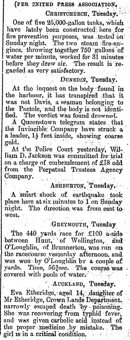(PER MTITBD PJHESS ASSOCIATION". Ghbistchubch; Tuesday. "' '- : - One of five 251000-gallon tanks, which have lately been constructed:, here .for fire prevention' purposes, . was tested' on/ Sunday night. The two steairi i :fire T engines; throwing:' together 750 gallons of water per ininnte, worked for 31 minutes before they drew air. The result is regarded as very satisfactory. , , DdnkdiN, Tuesday. At tho inquest on the body found m the harbour, it has transpired 4hat it was not Davis, a seaman belonging; to the Pactole, and the body is riot identified. The y erd ict was found drowned. A Queenstown telegram states . that the Invincible: Company have struck a a leader, 1£ feet inside, showing coarse gold. ■- '.•'"■'.. ,■■■::. '■;■; -, . . , : At .the Police Court yesterday, Wil-, Hani D. Jackson was committed for trial on a charge of, embezzlement pf £18 odd from the Perpetual Trustees Agency Company. . . . '..'.; ;■ ■ / AsHßimTONi 'Tuesday.A snkrt shock of earthquake : took place here atsix.iuinutes to 1 on Sunday night; The direction was from' east toWOSti Greymouth, Tuesday The 44O.yards race for £100 a-side between Hunt, 'of Wellington,, dnd Q'Loughlin, of Brunnerton, was run on the racecourse yesterday afternoon, and was won by O'Longhiin by a couple of yards. Time, f>6gsac. The course was •.• covered with pools of water. '* ■'.'■«■■■' 1 Auckland, Tuesday. Eva Ethertd£?e, raged 14,: idaiogHter of Mr Etheridge, Crown Lands Department, narrowl}' escaped death by -poisoning. She •' was recovering from typhid fever, and was given carbolic acid instead 6f the proper niedicine ,by mistake. The 1 girl is m a. critical condition. • - r -