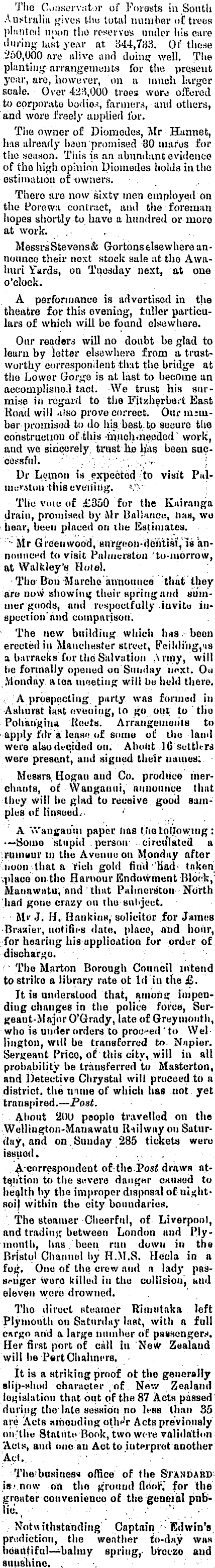 The Cii.)Korv.it>r of Forests m South Australia gives thu total inunber ot' trees planted ujH»n tho reserves under his care during lust year at 344,733. Ot these 260,000 are alive and doing well. The planting- arrangements for the present i year, are, however, on a much larger scale. Over 423,000 troes were offered to corporate bodice, fanners, and others, and wore freely applied for. The owner of Diomodes, Mr Hannefc, has already been 'promised 30 mafus for the season. This is an abundant evidence of the high opinion Diomedes holds m the estimation of owners. There are now sixfcv men employed on the forewa contract, ami the foreman hopes shortly to have a hundred or more at work. . . Messrs Stevens& Gortons elsewhere announce their next stock sale at tho Awahuri Yards, on Tuesday next, at one o'clock. A performance is advertised m the theatre for this evening, fuller particulars of which will be found elsewhere. Our readers will no doubt be glad to learn by letter elsewhere from a trustworthy correspondent that the bridge at the Lower Gorge is at last to become an accomplisncl tact. We trust his surrnhe m regard to the Fitzherbtti't East Koad will -ilko prove correct. Our member promised to do lm best, tp secure tlte construction of this "•in.uchm'e.o'dcd * work, and we sincerely, trust lie has been successful. ."'■;' . •': '.'•;. ■.">■»- ; Dr Lemon is expected to visit Pnlmur.iton this evening. VV The viku of £350 for the Kairanga ; drain, promised by Mr Lialiaucu, bntt> we hear, beeu placed on ilie Estimates. " Mr Greenwood, Hnrgeoh-dentisJ, is announced to visit Puluicraton to-morrow, at Walkley's Hoi el. The Bon Marche announce that they are now showing their spring and summer goods, and rtspoctfully invito iuspeciioii'and comparison. The new building which has been erected m Manchuster street, Fcildi'ng,'«B a barracks for the Salvatioii A rmy, will be foruially opened on Sunday next. On Monday, a tea meeting will be held there. .: A prospecting party was formed m Ashurst last oveuing, to go out to the Pohangiua Koeta. Arraugemeu'ls to apply f<h* a leas'.* of some of the land were alsodtcided on. Aboitt ,16 scttU-rs were present, and signed their names: Messrs, Hogau and Co. produce merchantß, of Wangautii, announce that they will be glad to receive good samples of linseed. A *\Vangan*u> paper has Kietollowing: — Some Btupi«l person circulated a ruinuur m the Avenuu on Monday after noon -that a rich gold find 'Had' tft .k er V .place on tho Harnour Endowment -Blocik,'* Manawatu, and that Paltncrs'tou North had gone crazy on the subject. Mr J. H. I] ankiriH, solicitor for Jamuß -Braxier, notifies date, place, and hour, for hearing his application for order of discharge. ' The Marton Borough Council intend to strike a library rate ot Id m the &. Tt is understood that, among impendiug changes m the police force, Ser-geaut-Major O'Grady, late of Grey month, who is under orders to proceed ' to Wei • lington, will be transferred to Napier. Sergeant Prico, of this city, will m all probability be transferred to Masterton, and Detective Chrystal will proceed to a district, the mine of which has not yet transpired.— Post. ! About 200 peoplo travelled on the Wellingtoii-Matiawatu Kiilway on Saturday, and on.Suuday 285 tickets were issuod. . . Acorrespondent of the Posi draws atten'tioi) to the severe danger caused to health by the improper disposal of night* soij within thu city boundaries. The steamer Cheerful, of Liverpool, and trading between London and Plymouth, has been ran down m the Bristol Channel by H.M.B. Heela m a fog. One of the crew and a lad}' passriiger were killed m the collision, and eleven were drowned. The direct steamer Rimutaka left 'Plymonth on Saturday last, with a full cargo and a large number of passenger*. Her first port of call iv Ne«r Zealand will be P»rtChalin«'rs. It is a striking proof ot the generally slip-sluxj character \of Nev/ Zealand legishttion that out of the 87 Acts passed ! during the late session no Ifss than 35 are Acts simoudingpthp'r Acts previously onfllie Statute ' Book, two wore validation Acts, and one an Act to iutprpret another Acf..\ . ■•:■ ■ ■■■..- Tlie busiuesx office of the Standard-is-.now on tho ground floor," for the greater convenience of the general pub.^.V ■' ; " ;/ ; •..■■■■■' "-..■■■" Notwithstanding Captain Kdwln'a pri'.diction, the weather to-day was bdanfiful— -balmy spring,- breeze and sunshine. . ,
