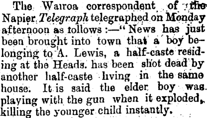 The. Wairoa correspondent , ;pf -/jtßo* Napier. Telegraph telegraphed on Monday afternoon as tollows :— " News has just been brought into town that a 'boy belonging to, "A. Lewis, a half-caste residing at the Heads, has been shot deadly another half-caste hying m the same house. It is said the elder, boy was. playing with the gun when it exploded* killing the younger child instantly. . .