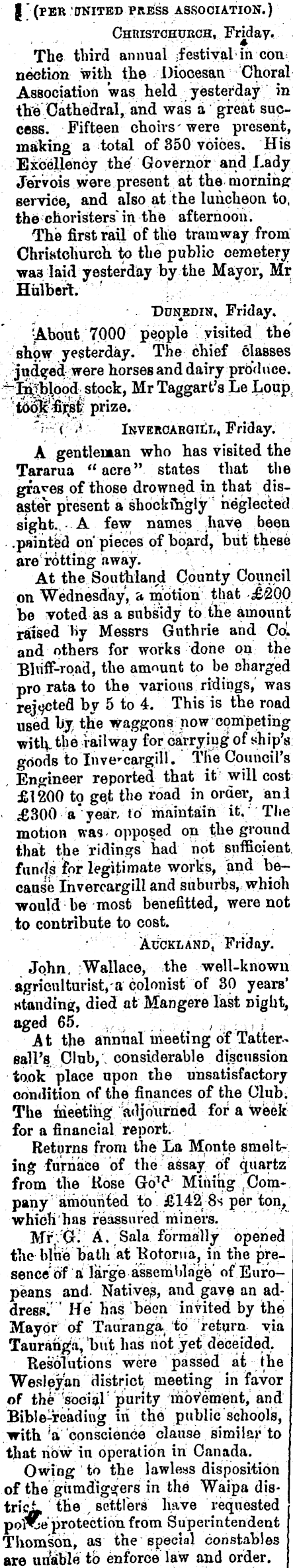 I " (PER .'UNITED PRESS ASSOCIATION. ) Christchtoch, Friday. The third annual ;f estiyal m con necfcion with the Diocesan Choral Association was held yesterday m the /Cathedral, and was a great success. Fifteen choirs were present, making a total of 350 voices. His Excellency the' Governor and Lady JeVvois were present at the morning service, and also at the luncheon to, the choristers* in the afternoon. The first rail of the tramway from Christchurch to the public cemetery waa i laid yesterday by the Mayor, Mr Huiberl. "' : . Dunedin, Friday. About 7.000 people visited the shdw yesterday. The chief classes judged were horses and dairy produce. stock, Mr Taggart's Le Loup ■to6]|^i|| prize. "'■' : ; -' < ''-'/$■ Invercabgili., Friday. A gentleman who has visited the Tararua " acre" states that the graves of those drowne.d m that disaster present a shockingly neglected, sight.,- A few names .have been .painted on' pieces of board, but these are rotting away. . At the Southland County Council on Wednesday, a motion that be voted as a subsidy to the amount raised Hy Messrs Guthrie and Co. and others for works done on the Bluff-road, the amount to be charged pro rata to the various ridings, was rejected by sto 4. This is the road used by the waggons now competing witlv the railway for carryiug of Khip's goods to Inve'cargiil. The Council's Engineer reported that it will cost £1200 to get the road m order, an! £300 a year/ to maintain it.' The motion was- opposed on the ground that the ridings had not sufficient, funfls for legitimate works, and because Invercargill and suburbs, which would be most benefitted, were not to contribute to cost. -. • Auckland, Friday. John, Wallace, the well-known agricnlturist,-a colonist of 30 yeara' Htanding, died at Mangere last Dight, aged 65. . , ; : . .' At the annhal meeting of TatterBall's Club, considerable discussion took place upon the unsatisfactory condition of the finances of the Club. The meeting ><!jourried for a week for a financial report; Returns from the La Monte smelting furnace of the assay of Quartz from the Rose Go'c 1 Mining pany amounted to £142 |8s per ton, whicli'has reassured miners. Mrv'Cr/ A. Sala formally opened the Wne bath at Kotoriia, m the presence of a large assemblage' of Europeans and. Natives, and gave an address.' ' He has been invited by the Mayor of Tauranga to return via Tauraiiga, but has riot yet deceided. Resolutions were passed at the Wesleyan district meeting m favor of the f sociar purity /mbv'ement, and Bible-reading m the public schools, with ; a conscience clause similar to that ribw m operation m Canada. Owing to the lawless disposition of the ghmdig^ers m the Waipa distri^L the settlers have requested pot^e protection from Superintendent Thomson, as the special constables are utfeble tb enforce law and order.