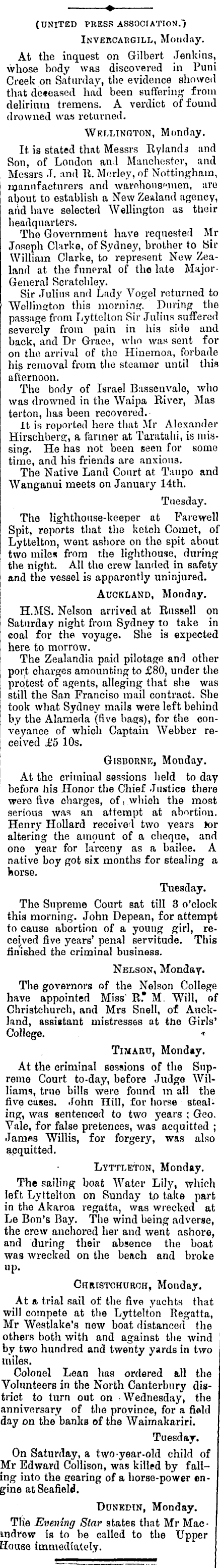 • (UNITED PRESS ASSOCIATION.") Invercabgjll, Monday. At the inquest on Gilbert Jenkins, whose body was discovered m Puni Creek on Saturday, the evidence showed that de«eased had been suffering from delirium tremens. A verdict of found drowned was returned. Wellington, Monday. It is stated that Messrs Rylands and Son, of London and Manchester, and Messrs .T. and R. Merley, of Nottingham, manufacturers and warehousemen, are about to establish a New Zealand agency, and have selected Wellington as ttieir headquarters. The Government have requested Mr Joseph Clarke, of Sydney, brother to Sir William Clarke, to represent New Zealand at the funeral of the late MajorGeneral Scratchley. Sir Julius and Lady Yogel returned to Wellington this morning. During the passage from Lyttelton Sir Julius suffered severely from pain m his side and back, and Dr Grace, who was sent for on tho arrival of the Htnemoa, forbade his removal from the steamer until this afternoon. The body of Israel Bassenvale, who was drowned m the Waipa River, Mas terton, has been recovered. It is reported here that Mr Alexander Hirschberg, a farmer at Taratalii, is missing. He has not been seen for some time, and his friends are anxious. The Native Land Court at Taupo and Wanganui meets on January 14th. Tuesday. The lighthouse-keeper at Farewell Spit, reports that the ketch Comet, of Lyttelton, wont ashore on the spit about two miles from the lighthouse, during the night. All the crew landed m safety and the vessel is apparently uninjured. Auckland, Monday. H.MS. Nelson arrived at Russell on Saturday night from Sydney to take m coal for the voyage. She is expected here to morrow. The Zealandia paid pilotage and other port charges amounting to £80, under the prqtest of agents, alleging that she was still the San Franciso mail contract. She took what Sydney mails were left behind by the Alameda (five bags), for the conveyance of which Captain Webber received .£5 10s. Gisbornk, Monday. At the criminal sessions held to day before his Honor the Chief Justice there were five charges, of , .which the most serious was an attempt at abortion. Henry Hollard received two years tor altering the amount of a cheque, and one year for larceny as a bailee. A native boy got six months for stealing a horse. Tuesday. The Supreme Court sat till 3 o'clock this morning. John Depean, for attempt to cause abortion of a young girl, received five years' penal servitude. This finished the criminal business. Nelson, Monday. The governors of the Nelson College have appointed Miss' R.* M. Will, of Christchurch, and Mrs Snell, of Auckland, assistant mistresses at the Girls' College. «■ Timartt, Monday. At the criminal sessions of the Supreme Court to-day, before Judge Williams, true bills were found m all the five cases. John Hill, for horse stealing, was sentenced to two years ; Geo. Vale, for false pretences, was acquitted ; James Willis, for forgery, was also acquitted. Lyttleton, Monday. The sailing boat Water Lily, which left Lyttelton on Sunday to take part m the Akaroa regatta, was wrecked at Le Bon's Bay. The wind being adverse, the crew anchored her and went ashore, and during their absence the boat was wrecked on the beach and broke up. Christchuroh, Monday. At a trial sail of the five yachts that will compete at the Lyttelton Regatta, Mr Westlake's new boat distanced the others both with and against the wind by two hundred and twenty yards m two miles. Colonel Lean lias ordered all the Volunteers m the North Canterbury district to turn out on Wednesday, the anniversary of the province, for a fiald day on the banks of the Waimakariri. Tuesday. On Saturday, a two-year-old child of Mr Edward Collison, was killed by falling into the gearing of a horse-power engine at Seaneld. Dunedin, Monday. TKe Evening Star states that Mr Macandt'ew is to be called to the Upper House immediately.