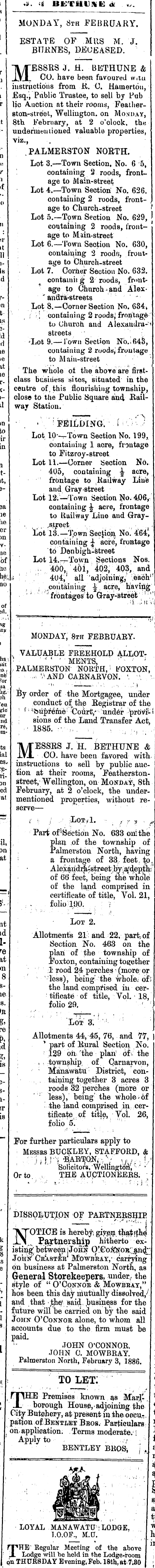 .». H BUT HUNK ** . MONDAY, Bth FEBRUARY. ESTATE OF MRS M. J. BUKNES, DECEASED. MESSRS J. H. BETHUNE & CO. have been favoured witu instructions from it. C. Hamertou, Esq., Public Trustee, to sell by Pub lie Auction, tit. their rooms, Feailier-ston-street, Wellington, on Monday, Bth. February, at 2 o'clock, the undermentioned valuable properties, viz., .PALMERSTON NORTH. Lot 3. — Town Section, No. 6 5, containing 2 roods, frontage to Main-street Lot 4.— Town Section No. 626. containing 2 roods, frontage to Church-street ' Lot s.— Town Section No. 629, J containing 2 roods, frontage to Main-street i Lot 6.— Town Section No. 630, | containing 2 roods, .frontage to Church-street Lot 7. Corner Section No. 632. contamii g 2 roods, frontage to Church -and Alex- * anflta-streets ' Lot B.— Corner Section No. 634 t ; ; containing 2 roods; frontage to Church and Alexandra--* streets ,"".,. ' >Lot 9.— l'own Section No j 643, containing 2 rooda, froulago to M aiu-street The whole ot the above are firstclass business sites, situated m the ceutre of, this nourishing township, close to the Public Square and, Bailway Station. • \"'i FEiLDING. i =0' .-<' Lot 10-^-Town Section No. 199, containing 1 acre, frontage to Fitzroy-street Lot 11. — Corner Seotion No. 4Q5, containing acre, frontage to Railway Line and Gray -street Lot 12i — Town Section No. 4,06, containing^ acre, frontage to Railway Line and Gray- . . . Atfeet t , Lot 13. — T,own Section. No. 464, containing \ acre, frontage to Denbigh-street Lot 14.-r-To\vn Sections Nos. ■■■ 400 }i 401, 4Q2, 403, and .& I .404,' all adjoining/ each 1 * . i , acre, havirtg ; frontages to Gray-street !l ' MONDAY, Bth FEBRUABY. . VALUABLE FREEHOLD ALLOT- ■' ■ '"' l ' MENTS, ' '■ ■' ' PALMERSTON NORTH, '• b'OXTON, - V^AND GABNARVON. '. \\ ' By order of the Mortgagee, under conduct of^the Eegistrar of the '■ - ; 4 biipfeme f Courts "under pr6v££ . : sions of the Land Transfer Act, .. " 1885. :•.-■„. ; , ' ■ :; :,, ....■ MESSES J. H. iETHUNE & CO. have been favored withinstructions to sell by public auction at their rooms, Featherstonstreet,' Wellington, on Monday, Bth February, at 2 o'clock, the undermentioned properties, without reserve — f ■; / " iLOTf 1. - . yy ? , g Part of No. 633 onithe plan, of the township of Palmerston North, having i a frontage of 33- feet, to. Alexai|drjb,fstr6et;by^a}'dep|hr' of 66 teet, being me whole of the land comprised m - certificate of title, Vol. 21, • ;v . folio li) 0. ■ r ■ Lot 2. Allotments 21: and 22, part of Section No. 463 on the plan of the township of Foxton, containing together ; 1 rood 24 perches • (more or 'less), being the whole; ofi the land comprised m certificate of title, Vol. • 18, f0H029. ■•■'. ■', "Lot 3. ' ; : : Allotments 44, 45, 76, and 77, * part of Eural Section No. 129 oh, 'the plan 5 <&/ the ■t township, of Carnarvon, ; Manawa-tu"' District, con- , . taining together 3 acres 3 roods 32 perches (more or ' less), being the wholes of ■ the land comprised m certificate^ of title, Vol. 26, folio 5. ■•' ■ i - ■ '. ■ For further particulars apply to Messrs BUCKLEY, STAFFORD, & ; j.H i W;-!'' 1 Solicitors, WelllngtonV- * 0rt0.,..v THE AUpTIONEEBS. ; DISSOLUTION OF PABTN^BSHI? VfOTICB is hereby: giyeii- that^h| JlN^ Partnership hitherto existmg] between; Join* O'Joos^o]i:;ahd^ Jokisr 'Ck'ast^V Mowbrit, 1 carrying on business at Palmerston North, as General Storekeepers, under, the style of " O'Connor & Mowbbat," hos been this day mutually dissolved/ and that ',they said, business for the future will be carried on by the said John O'Connor alone, to whom all accounts due to the firm must be paid. • JOHN O'CONNOB. JOHN C. MOWBBAY. Palmerston North, February 3, 1886. to let: , fTIHE Premises known as Marlt _L borough House, adjoining the City Butchery, at present m the oocu- , pation oiBENTiiET Bros. PartieuJarßj ( on. application. . Terms moderate/ ■ Apply to . ,; BENTLEY BBOS, ] . LOYAL MANAWATU \ LODGE. 1.0.0 F., M.O. rpHß' Regular Meeting of the above ' JL Lodge -will be held m the Lodge-i-oom on THURSDAY Evening* Feb. 18th, at 7 ! .8O L