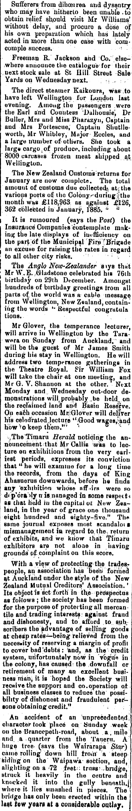 Sufferers from dihceirea and dysentry who may have hitherto been, unable .to obtain relief should visit Mr Williams! without delay, and procure a dose of his own preparation which has lately acted m more than one case with 'comcoin pie success. - . Freeman R. Jackson and Co. elsewhere announce tlie catalogue' for their next stock Bale at St Hill Street Sale Yards on Wednesday next. ; m ... :„■ The direct steamer Kaikoura, was to have left Wellington for London last evening. Among the passengers were the Earl and Countess Dalhousie', Dr Buller, Mrs and Miss Pharazyu, Captain and Mrs Fortescue, Captain Shuttleworth, Mr VVhibley, Major Eccles, and a large number of others. She took a large cargo. of produce, including about " 8000 carcases frozen meat shipped at Wellington. The New Zealand Customs returns for January are now complete. The total amount of customs due collected^ at;: the various ports of ihe Colonyr-durfugfthe month whs £118,963 as against £126, 362 collected m January, 1 N 88"5. " tt I It is rumoured (says the Post) the Insurance Companies contemplate making the late displays of inefficiency on the part of the Municipal Fire r ßrigade an excuse for raising the rateß m regard to all oilier city risks. ! : . I The Anglo New-ZcaUiridcr siys 'thai ; Mr W.E. .Gladstone celebrated his 76ih birthday oh 29th December. Amongst hundreds of birthday greetings trout all parts of. the world was a cable message from Wellington, New Zealand, containing the words *• Respectful congratuia tions. Mr Glover, the temperance lecturer, will arrive m Wellington by the Tarawnra on Sunday from Auckland, and will be the guest of Mr James Smith during his stay m Wellington. He will address two temperance gatherings m the Theatre .Royal. Fir William Fox will take the chair «t one meeting, and Mr G. V. Shannon at the other. * Next Monday and. Wednesday out-door demonstrations will probably _be held, on the reclaimed land and Basin Reserve. On each occasion MttGlover will deliver his celodVatedJecture "Good wages,?and how ? 'o keep them.*" *' s '"• r \.The"Tiraaru Herald, noticing the announcement that Mr Callis was to lecture en exhibitions from the very earliest periods, expresses its conviction that "he will examine for a long time 1 the records, from the days of King Ahasuerus downwards, before ha finds { any 'exhibition whose nff -irs were so di •p'ora'ily n is nanaged m some raspectn as that held m the capital o£ Now Zealand, m the year of grace one thousand eight hundred and eighty-five." Th* sa me journal exposes most scandaloi s mismanagement m regard to. the > return of exhibits, and we know that Timaru exhibitors are not aloae m having grounds p£ complaint on this score. With a view of protecting the trades* people, an association has been formed at Auckland under the style of the New Zealand Mutual Creditors' Association. ' Its objeot is set forth m th;e prdspectus as follows ; the society has been formed for the purpose of protecting all mercantile and trading interests; against fraud and dishonesty, aud to afford to sub scribers the advantage of selling goods at cheap rates— being relieved from the necessity of reserving a margin of profit to cover bad 'debts : r and, as ihe credit system, unfortunately now m vogue m the colony, has caused: the .downfall or retirement of many an exoellent business rriahi it is hoped the Society will receive the support and co. operation qt all business classes to reduce the possibility of dishonest and fraudulent persons obtaining credit." , , An accident of an unprecedented: character took place on Sunday week on the Brancepelh-road, about .a , mile and, a qunrter from the Tauerii. A huge tree- (says, the Wairarapa $t(ir) came rolling down hill troiii a steep siding on the Waipaw'a section, and, alighting on a 72 feetn truss' bridge, struck it heavily m the centre and knocked it into the gully benoath.j where it lies smashed m pieces. The bridge has only been eructed within the last tew years «t a considerable outlay.