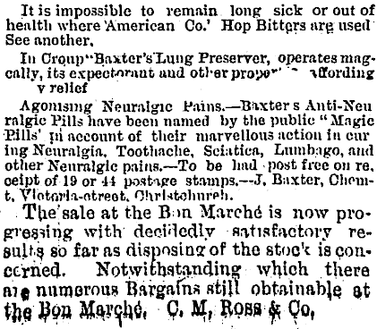It is impossible to remain long sick or out of health where 'American Co.' Hop Bitters nrg used See another. In Crqup"Baxter's'Lmig Preserver, operates magcally, its expectorant und otl-arproiw' " -iffordiug v relief Agonising Neuralgic Vains. — Baxter s Anti-Neu ralgic Pills have been named by the public "Magic •Pills' {ii account of their marvellous action m cur ing Neuralgia, Toothache, Sciatica, Lumbago, and other Neuralgic pains. — To be had ■ post free on re. oeipt of 19 or 44 postage stamps,— J, Baxter, Clipuit. Y'otnJ'la-otreot. Ol\rUtohnr>h. The'sale at the B>n Marehe is now profrressin'g wjth decidedly satisfactory resu.lti? so far as disposinsrof the stoc'i iscou< ccrixed. Notwithstanding which there aif nurnerou? Bargains stjll obtainable, at thj #0» Mayc^, Q, ]ROBf» Qo, j