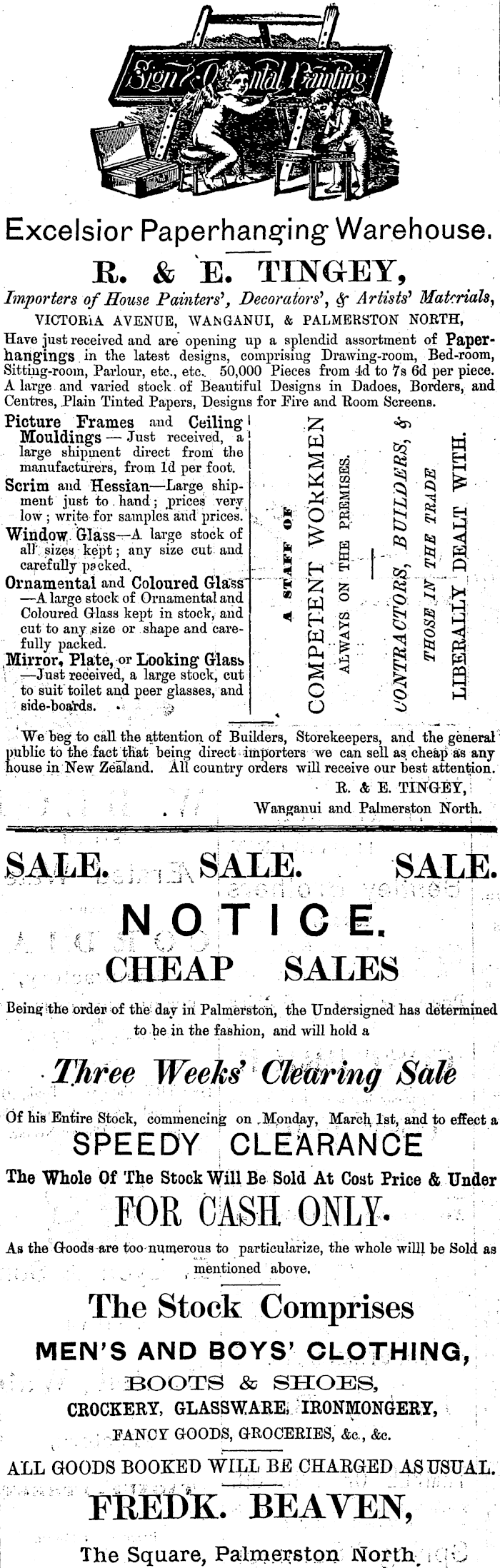 Excelsior Paperhanging Warehouse. R. & ErTESTGEY, Importers of House Painters' ', Decorator s\ Sf Artists' 1 Materials, VICTORIA AVENUE, WANGANUI, & PALMERSTON NORTH, Have just received and are opening up a splendid assortment of Paperhangings m the latest designs, comprising Drawing-room, Bed-room, Sitting-room, Parlour, etc., etc.. 50,000 Pieces from Mto7s 6d per piece. A large and varied stock of Beautiful Designs m Dadoes, Borders, and Centres, Plain Tinted Papers, Designs for Eire and "Room Screens. Picture Frames and Ceiling' <*r> Mouldings — Just received, a fjj fclj large shipment direct from the H manufacturers, from Id per foot. w S to M Scrim and Hessian— Large ship- > W g <^ cj p ment just to . hand ; prices very , , p* S S low ; write for samples, aiid prices. -§ O s! S Win^OVT Glass— A large stock of to 6q "3 all': sizes kept ; any size cut and t v I • -■■■ S carefully packed.. . _ - \ H C?T Ornamental and Coloured (Jla"ss~ ~ fr "^ — A large stock of Ornamental and ® r^j O . . -S Coloured Grlass kept m stock, and r^ cq cut to any size or shape and care- rvl B^' § < fully packed. S r P - 2 W Mirror, Plate, or Looking Grlass S!3 S ■W. ; r—Jußt received, a large stock, cut ■ j> p; to suit toilet and peer glasses, and O O h? side-boards. .\ i^ O We beg to call the attention of Builders, Storekeepers, and the general* public to the fact that being direct importers we can sell as cheap" as any house m New Zealand. All country orders will receive our best attention. E. & E. TiNGKET J ; j ,_ : .V? "Wanganui and Palmerston North. iMii, i ,-, ' ' . M SALE. : 4 ;;;:jM^Ti I: ac' il -^|" ;;.*, :.;;;. cBQEAi* . sales ; - .v ; : ■- Beingj Ithe order of thW day in 1 Palmerston, the Undersigned has determined to be m the fashion, arid will hold a Three JFeeks* *' (MMring Salk I '..• . ' . :■ i ■ ■ ■ ' . ■•■■.••-' -." ■■;.•_ . j Of his Entire Stock, commencing on r Mpnday, March Ist, and to effect a ! SPEEdY ; CLEARANCE ! j The Whole Of The Stock Will Be Sold At Cost Price & Under FOR CISH ONL¥ V r As the Groods are too numerous to particularize, the whole willl be Sold as . mentioned above. ; The Stock Comprises MEN'S AND BOYS\GLpT"HING r • 3300TS & SHOES, CROCKERY, GLASSWARE; IRONMONGERY, : . EANCr GOODS, GROCERIES, <fec,&c. ALL GOODS BOOKED WILL BE CHAEGKED } M USI^AL. ""^ : ' .;■ The Square, Palmgrston Noytli. iCjo
