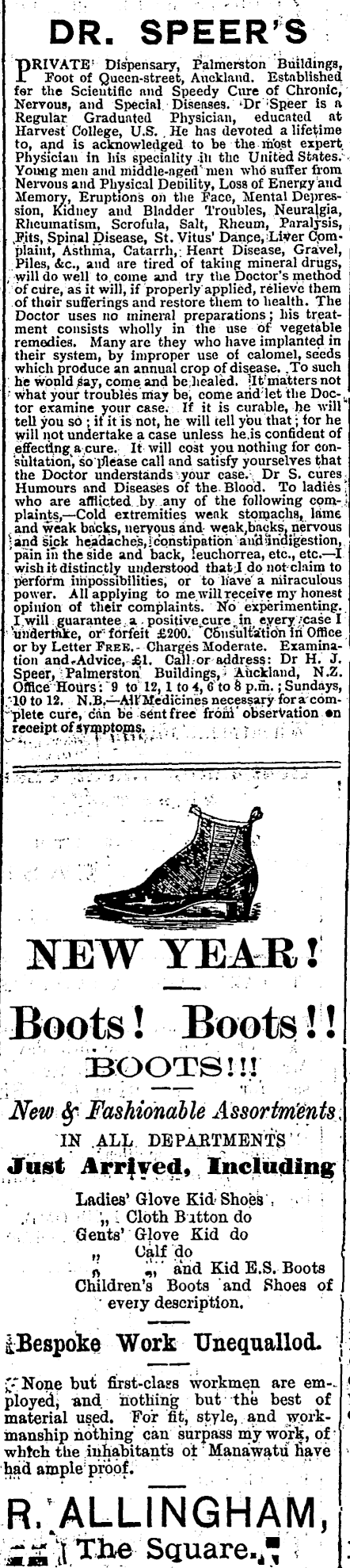 DR. SPEER^ PRIVATE 5 Dispensary, Palmerston Buildings, L Foot of Queen-street, Auckland. Established fsr the Scientific and Speedy Cure of Chronic, Nervous, and Special Diseases. l Dr ; Speer is a Regular Graduated Physician, educated at Harvest College, U.S. . He has devoted a lifetime to, and is acknowledged to be the ritost expert Physician m his speciality ih the United States.^ Young men and middle-ngetl' men who suffer from Nervous and Physical Deoility, Loss of Energy and Memory, Eruptions on the Face, Mental Depression, Kidney aud Bladder Troubles, Neuralgia, Rheumatism, Scrofula, Salt, Rheum, Paralysis, .Fits, Spinal Disease, St. Vitus' Danpe.iLWer Cpmplaint, Asthma, Catarrh, Heart Disease, Gravel, Piles, &c, aud are tired of taking mineral drugs, /will do well to. come and try the Doctor's method . of dire, as it will, if properly applied, relieve them of their sufferings and restore them to health. The Doctor uses no mineral preparations; his treatment consists wholly m the use of vegetable remedies. Many are they who have implanted m their system, by improper use of calomel, seeds which produce an annual crop of disease. .To such ; he wpnld^ay, come and behealed. Ut'matters not " what your troubles may be, come aridiet the Doc- v tor examine your case. : If it is curable, he will tell you so •itit is not, he will tell you that ; lor he will not undertake a case unless he.is confident of effecting acure. It will coat you nothing for Consultation, so please call and satisfy yourselves that the Doctor understands -, your case.\ Dr S. cures. Humours and Diseases of the. Blood. To ladies . who are afflicted by any of the following cpm,-j plaints, — Cold extremities weak stomachs, lame . and weak backs, nervous and- weak,backs, nervous ;and Sick hea'dache's,icpnstipati6nand 'indigestion, 'pain iii the side and back, leuchorrea, etc., etc. — I . wish it distinctly understood thatj do not claim to perform impossibilities, or to liave' a miraculous power. All applying to me will receive my honest opinion of their complaints. No experimenting.. I will ; guarantee . a ■ positive cure m eyery .'Case I 'uhderrake, or'- forfeit £200. 'CSnsulMidn m Office . or by Letter Free. - Charges Moderate. Examination and, Advice, £1. Call or address: Dr H. J. Speer, Palmerston Buildings,. Auckland, N.Z. Office' Hours : "9 to 12, 1 to 4, tf to 8 p.m. ; Sundays, .'lO to 12. N.B.— AllfMedicines necessary for a-cdm-"plete cure, can be s6ntfree frdM' observation «n receipt of Symptoms. _ .; . ;■. ; •• : .-, p : . j : ']'■■," NEW YEAR ! Boots! Boofe!! : ; /; ',r. : BpOTsr!r •*•' ; .. . New ' Sf 'Fashionable Assortments, IN .ALL. DEPARTMENT^" \ JTust Arrfyed, Including Ladies' Glove Kid Shoes ' , ■ ■ . ' , : : '„ i Cloth Bitton do Gents' Gtlove Kid do „ (Jalf do i - ,; ;,' and Kid E.S. Boots Children's Boots and Shoes of ■ every description. ißespoke Work Unequallod. i . - — : ■ ■< £-~None but first-class workmen are em-- i ployedj and nothing but the best of > material used. For fit, style,. and Trork- c manship nothing can surpass my wo):k, of ■ which tlie inhabitant's oi Manawatu nave ■ had ample^ proof. " R/ALLrNGHAM, Square.^ ; l