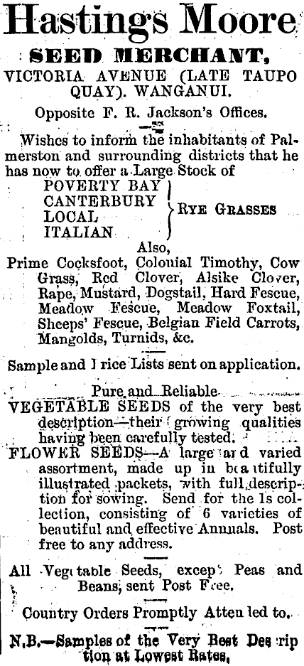Hastings Moored SEED MERCHANT, VICTORIA AVENUE (LATE TAUPO QUAY). WANGANUI. Opposite F. R. Jackson's Offices. Wishes to inform the inhabitants of Palmerston and surrounding districts that he has now to. offer a. Large Stock of POVERTY BAY ) . CANTERBURY ( R GkaBSES LOCAL >KYE trEASSES , ITALIAN . ) Also, Prime Cocksfoot, Colonial Timothy, Cow : Grass, Red Clover, Alsike Closer, ; ; Rape, Mustafd, Dogstail, Hard Fescue, Meadow Fescue, Meadow Foxtail, Sheeps' Fesque, Belgian Field Carrots, Mangolds, Turnids, &c. Sample and I rice Lists sent on application. ■r ' J_ Pure,and_Reliable- -..««.-. VEGETABLE SEEDS of the very best desdription-^their '•■[ growing qualities having been caref ully tested. J ; . '..L FLOWER SEED&— A large' aid varied , assortment, made up m bcaitifully illusi rated .packets, ivith f ulljlescrip-: tion foi v sowing. Send for the Is collection, consisting of 6 varieties of beautiful and effective Annuals. Post free to any address. All Veg( table Seeds, except Peas and V Beans) sent Post Fiee. Country Orders Promptly Atten led to,. N.B.— Samples of the Very Best Peg Tip tion at lowest RfMro,