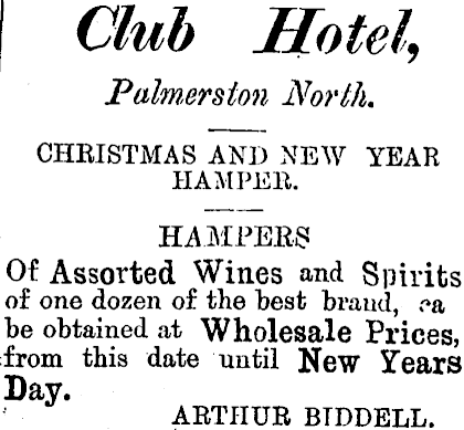 Club Hotels Palmer ston North. CHRISTMAS AND NEW YEAR HAMPER. HAMPERS Of Assorted Wines and Spirits of one dozen of the best brand, r»a be obtained at Wholesale Prices, :from this date until New Years Day. ARTHUR BTDDELL.