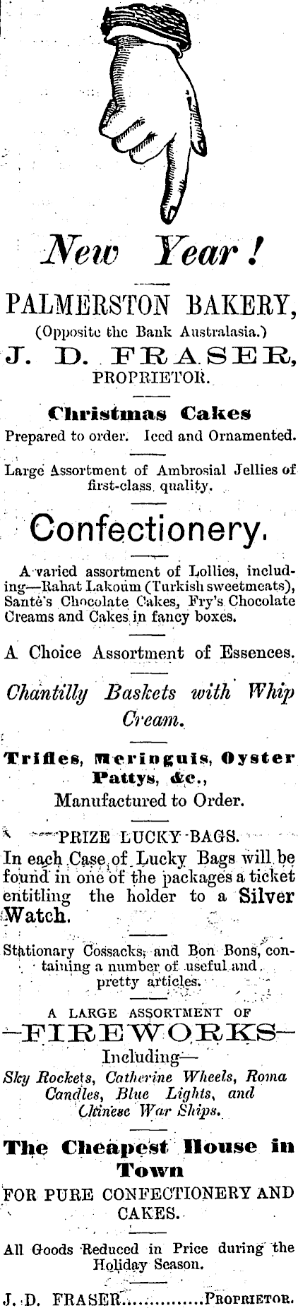 JVeiv Year! PALMERSTON BAKERY, (Opposite the Bank Australasia.") J\ 13. FRA SEE,, PROPRIETOR. Christinas Cakes Prepared to order. Iced and Ornamented. Large Assortment of Ambrosial Jellies of first-class, quality. Confectionery. A varied assortment of Lollies, including— llahat Lakouni (Turkish sweetmeats), Sante's Chocolate Cakes, Fry's Chocolate Creams and Cakes, m fancy boxes. A Choice Assortment of Essences. Chdntilly Baskets with Whij) Cream. Trifles, Ifleringuis, Oyster ■ . .- Pattys, «kc., Manufactured to Order. \ —PRIZE LUCKYBAGS. In eacV.Casejpf^ Lucky Bags will.be found m one "of the packages i'a .ticket entitling the holder to a Silver c .Stjitionary Cossacks; and Boh Bons,'con- : , • taiuing a number of useful and, , ■ pretty ai'tiqles. - - A LARGE ASSORTMENT OF Including^Slcy Rockets, Catherine Wheels, Roma Candles, Blue Lights, and Uttrievc War Ships. The Cheapest House m Town FOR PURE CONFECTIONERY AND . . CAKES. All Goods Reduced m Price during the Holiday Season. J. *D. FRASERT.*.... ....Phoprietok.
