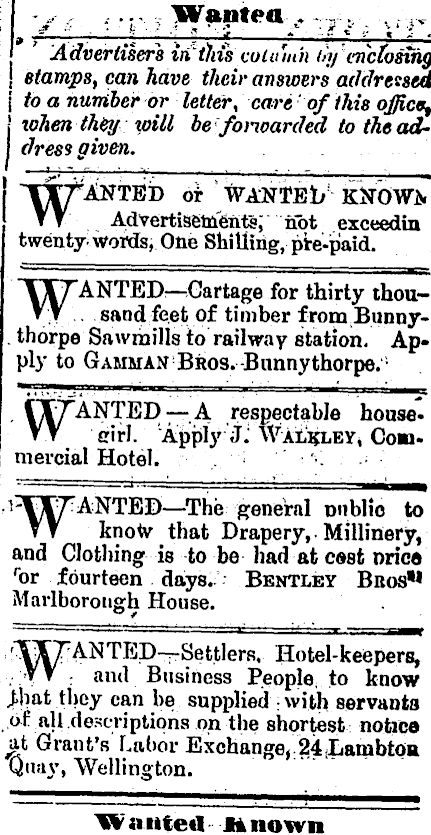 • Advertisers iii' this 'column i>y enclosing stamps, can have their answers addressed | to a number or letter, care of this office, when thfy will be fonaarded to the address given. ~IT/ANTEi) o i ' tVAtfITEi/ Kttbwi. TT A.dvertiaenients; not exceedin twenty words, One Shilling, pre-paid. TXTANTEDr-Cartage for thirty thouVy . sand feet of timber fromJß.unny- . thorpe Sawmills to railway station. Apply to GAMMAN'BROS.-Bnnnythorpe.- . jnTTANTED — A respectable house*. T.Y eirl. Apply J. : WAi^LEYi Commercial Hotel. . ■'•'. The general Dnblic to TT know that Drapery,. Millinery, and Clothing is to be had at cast one© r or fourteen days. Bentley Bros* l Marlborough House. WANTED^-Settlers, Hotel-keepers, : and Business People, to know ,that they can be supplied with servants >f all. descriptions on the shortest notice at Grant's Labor Exchange, 24 Lambton Quay, Wellington. \¥ a iitea 14 nown