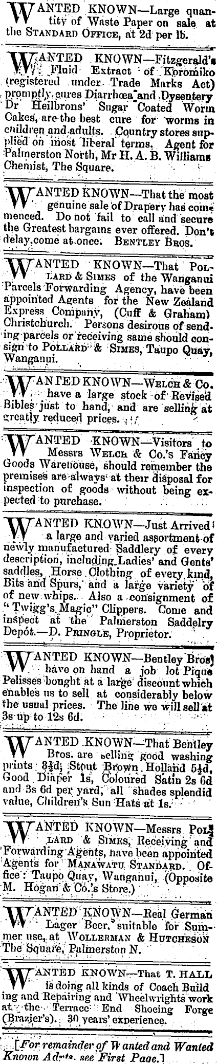 WANTED KNOWN— Large quantity of Waste Paper on sale at the Standard Office, at2dperlb. TI77ANTED KNOWN— Fitzgerald* *!*/'•' Fluid Extract :of "Kjprdmiko (registered under. Trade Marks Act) , promptly, cures Diarrhoea^and Dysentery 'Dr Heilbrons' Sugar "Coated Worm Cakes, are the best cure for worms m children and adults. , Country stores supplied on most 'liberal' terms. Agent for Palmerston North, Mr H. A. B. WilHaras Chemist, The Square. . ; TTTANTED KNOWN— That the most T T '■' genuine sale of Drapery has com* menced. Do hot fail to call and secure the Greatest bargains ever offered. Don't delay. come atonce. Bentley Bros. TXTANTED KNOWN— That Pol^ _T t xard •& Simes of the Wanganui Parcels Forwarding Agency, have been appointed Agents for the New Zealand Express Company, (Cuff & Graham) Christchurch. Persons desirous of sending parcels or receiving skuie should con- - sigh <to PbttAßD'ifc Simes, Taupo Quay, Wanganui. . •^nrr AN TED KNOWN— Welch & Co . _T'f;- havea large stock of Reyisecl Bibles just to hand, and are selling at greatly reduced prices. -;,' < W "ANTED KNOWN— Visitors to Messrs Welch & Co.'s Fancy Goods Warehouse, should remember the premises arealways^ at their disposal for inspection of goods without being expected to purchase. ::."■:,::. TXTANTED KNOWN- Just Arrived? T T a large and varied assortment of newly manufactured- saddlery of every description, includjng.Ladies' and Gents* saddles, Horse. Clothing of every. kind, Bits and Spurs,' and a large variety of of new: whips. Also a consignment of 'VTwigg's,. Magic" Clippers. Come and inspect at the Paln'ierston Saddelry Depot.— D. Pringle, Proprietor. ' TXTANTED KNOWN— Bentley BrosJ TT. have on hand a job lot Piqii* Pelisses bought at a large" discount which enables us to sell at considerably below the usual prices. The line we will sell it 3sup ; tol2s6d. :■■■•-•-.• ' : :•: WANTED .KNOWN— That Bentley Bros, are nelling "good washing prints; Bsd| jStout ißrbwn.HpUand 5Jd, Good Diaper is, Coloured Satin 2s 6d and -3s 6d per yard; all shades splendid value, Children's Sun Hats at ls. ; •"-' ' TTTANTED KNOWN— Messrs. Poll tt : .lard & Simes, Receiving ■ and 'Forwarding Agents, nave been appointed Agents for; Manawatu, Standard. Office : Taupo Quay, Wungahui, (Opposite ;M. _Hbgan^t!o.:B Store:) : : X TTTANTED' 1 KNOWN-Real German T^T ' ■ Lager Beer.* suitable for Sum- • mer use,.at Wollerman & Hutcheson The Squiirfe, Palmerston N. "TTTAKTiJI) kNOWNr-That T. HALL . Yt' is doing all kinds of Coach Build ing and Kejmiring and Wlieehviights work at^'fhe-. Ten-ace : '■: End Shoeing Forge CBrazier's). ; 30^ years' eiDerience. uV:,[/or remainder of Wanted and Wanted Known Adv*». see First PaaeJ