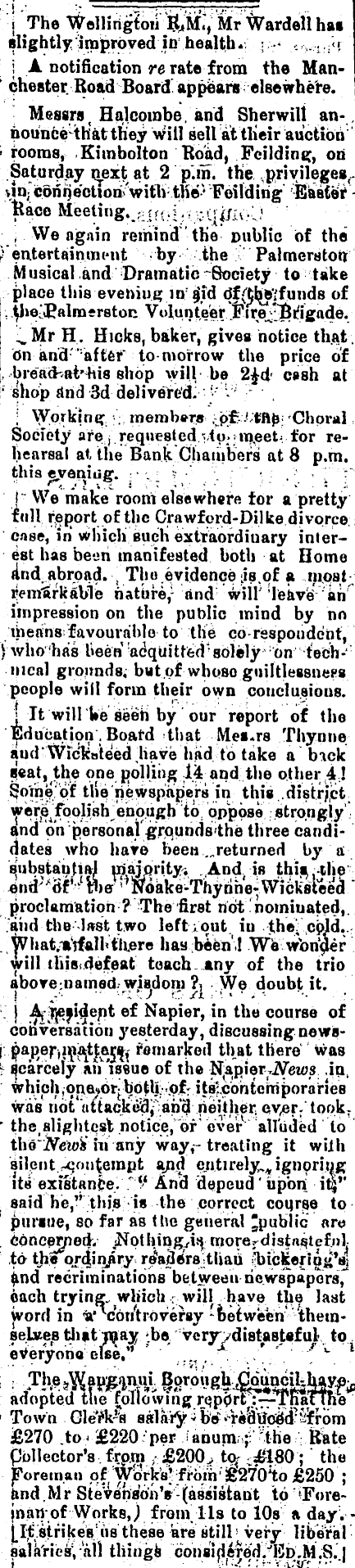 ' j The V|rdlirigloii Mr^ Wardell hat slightly improved m health, i ;- -•.<{ ' i A notification re rate from the Manchester Road Board' appears elsewhere. Messrs ( Halcoinbe, and Sherwill an-, nounce that they will sell at their auction |> rooms, Kimbolton Road, Feildine:, on Saturday i^ext at 2 p.ra. the v priyileges c *jn. conrjectjori'with tKe ' Foildirig Ettefer - Kace Meeting. pjj(.j,., ;(f^/r v .^< : , We again remind the public of the ?" entertainment •by \the ■';.' Palmeratoir Musical and Dramatic -Society to take place this evening m sjid df(^ifunds of •, .^lioißalnierston Volunteer *t'«re£Brtgade. Mr H . Hicks, baker, gives notice that > On an'd" : after" tomorrow the price of. , 'bre'ad^fttMtis shop will be 2£d r cash at 'shop arid 3d deliveredi -•-'" , I Vyorkin^ :; membra ; ; pE- ! ;tn&; Choral Society are j reqwested 'io-fin.eet-. for rehearsal at, tiie Bank Chambers at 8 p.m. this eyeniiig. -.1 ? . " ' . -'[ ""■" ' |~ VVe make room elsewhere for a pretty full report of the Crawfcrd-Dilke divorce. ; case, m which such extraordiuary interest has been manifested both at Home and abroad. t Tho evidence iis.qf a niostremarkable nature, 1 and will' ! lekve an impression on the public mind by ho tnetvns; favourable to the co respondent, ) who has lieen ! ac ! quitted 4 solely : oniech- : meal ground 8, ;-b«t. of whoso gniltlessnefa people will form their own conclusions. j^ It willWe seen by our report of the Education . Boafd that Mei.rs Thynne audWicknteed liaye had to take a back Beat, the one polling 14 and the other .4 J $o'me' of tiie newspapers m this . distrj,ct_ werjeYoplJsh enough i° : oppose • strongly and on personal groundsthe three candidates who have been ...returned by a substautiaJ inijtjrityi And, is thit.-tlie ..jnd^&iP ' Wie^N<lake-ThyDhei Wi6ksieed / proclamation ? The first not nomiuated, aiid the l«sfc two left i out iv has been',! We wbn^er will tliisi defeat toach any of the trio above ; named. wisdom ?, We doubt it. .j Aj-yieiWent ef Napier, m the course of conversation yesterday, discussing newsI paper, jn^tje^,- tlomarked tliat there was !r scarcely .an 'issue of the N^pier^iVews .m, which ,onie»6r[bjq!il|;.;ofr I tf t - con temporaries was not at tuckeSi and neither ev^r. took. • the^lightQst.nqtice/of' ever alluded to ihd~iyew)i hi any way,- treating it with ailent -^ontempt and entirely^ ignoring its existanOe. ." V An^ depeud ' iipbn it|'' I said he," this •is the correct course to I puriue, so far as tho general are . concerned; Not lnngyi^morer distant efnl, to the ojdin/ry re'adiratliau ibickerio«'sj recriminations between newspapers, each trying, which r will have the last jvord m vVon'trove^sy between- 'thetnse]»e t 8 tlutmay .be vcryvdistastaf ul to eVeryorio el6e." ' ..„.. . *' f '' l adopted the following re,p^rr:-^nat7ne < Town Clerk's B«lary4.fe^4«Btt(^ l Srpm J6270 .to* £220 per Janum,;! Hthe Rate pbllector's.frpm , POO^ tor #180; the JPoreinati of Work'BVfroift r £27oi;o £250 ; bnd Mr Stevens'onV- (assistant to lForejnatt of Works,) from lls to 10s a day. -- LljE.strikes us these art still ! very liberal salaries; -all things coiiaid^Ted/Eb.M.S.I