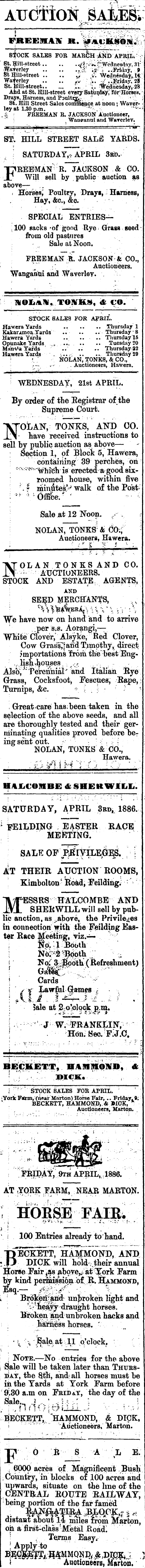 FRGEMAK R. >^i;it»ibm. S^OCK SALES FOR MABGH :ANb APRIL; * : St. lj[ill-Rtteet rfi^U^Werlnesdriy. 31 : WaTerJey V i? : i ..>Priiwy, 9 Si Hiltetreet .. .. J v. ■tyeariesdaf, 1* Woferley .. .. , v ■■ \. -/.; Friday, 2* St. Hill-street C, i. e anesday,.2S And at St. Hill-atreet every Satui^y; fdrHdrses. - Drays, Harness, and Poultry ;' , ':■. '■' ; St. Hill Street Sales commence at noon ; Waver- < ley at 1.30 p.m. ; , '"""'' . £ FREEMAN R. JACKSON Auctioneer, ~ ;- i Wancanui and Warerlev. stl hill street sale yards. . \ SATURDAY,? APRIL 3bd.TT'REEJMAN ' R. JACKSON & CO. jO Will sell by public auction as above — . Horsed Poultry, Drayi, i Harness, Hay, &c., &c. SPECIAL ENTRIES— , 100 sacks -of good Rye Graa« seed from old pastures Sale at Noon. FREEMAN It. JACKSON & CO., [ V ; ; •'.. Auctioneers. Wanganui and Waverlev. . WOI*AW, TOftTKS, <& CO. STOCK SALES FOR APRIL. Hawera Yards .. .. .. Thursday 1 Kakammea Yards .. .. ..Thursday -8 Hawera Yards .. .. .. Thursday 15 Opunake Yards . ... .. .. Tuesday SO Muni'a Yards ' ' .. .. .. Thursday -22 Hawera Yards . •,.... -j .. ... Thursday 29 ' '-" NOLAN, TONKS, & GO., ■ .--. T - . Auctionears, Hawera. ' \YEDNESDAY, 21st APRIL. By order of the Eegistrar of the Supreme Court. "VTOiiAN, TONKS, AND CO. ±S- have received instructions to sell by piibliq auction as above — : Section i, of Block 5, Hawera, containing 89 perches, on ■- c -:i' W = is erected a good sixroomed house, within five • . I minute^V walk of the Post- \* y *■'■ Office;* ' Sale *t 12 Noon. T » . NOLAN, TONES' & CO;| - Auctioneers, Hawera. ';* I T i '.:. -\TOLAS TONES AND CO. 1\ ; AUCTIONEERS. STOCK AND ESTATE. AGENTS, AND ■ SE^D MERCHANTS, "Vfe have now on hand and to arrive . per s;s. Aorangi,— WKite Clover/ Akyke, Red Clover, Cow Grassland Tjnipthy, direct importations from the'-best Eng:r: lish.houßes . <f . _. _ Alsb, J " 'Perennial' and Italian Rye Grass, Cocksfoot, Fescues, Rape, Turnips, &c. *.{;)■■ ' ' : ' Great care has; been taken m the selection of the above seeds, and all are thoroughly tested and their gerniinating qualities proved before be T ing sent out. ? :• . ?' ; NOLAN, TONES & CO., Hawera. .- . £fi i£\\ H 'Y Cj '* C-t < ; " HALCOMBE & §HEKWILL. SATURDAY, APRIL 3rd,, 1886. 1 FEILDING EASTER RACE MEETING. SALE OP [ AT THEIR AUCTION ROOMS, [ Kimbolton •- Road, Feilding. -""'=■ ll'/PESSRS H ALCOMBE AND . JU. SHERWILL will sell by publib anction, as the Privileges m connection with the Feilding Easter Race Meeting, yiz.-^- --; $p. I Bdbth \ Nb^^Bpbth J ;■ No:' 3 Booth (Refreshment) j Cards " (y Lawful Games f ; sale at^o-olqck p.m. \ - j w. Franklin; \ ' ; Hdn-Sec. ! FiJ.C. BECKETT, llArailOlirii, & •// .... ";.-• DICK. .•. , : , 1 ']■ '■-'■ STOCK SALES FOB APML. ; ' York F^nn, (near Mnrton) Horse Fair, .. Friday, 9: BECKETT, HAMMOND, & WOK, " ' . . ' Auctioneers, Marton. i ?^RIDA^ 9th APRIL,.. 188(6. V AT iYQRK NEAR MARTON. I HORSE FAIRi \> 100 Entries already to hand. ■jibScbtt^hahmoni),. and ;.I3 DICK will hold their annual Korse Fair jSis aboye,/at Farm by kind permission of Jl. Hammond, Esq.— Mh^' ■]■■ ' ■ X i : Brokfefi|and- unbroken light and ; "neajy draught horses. Broken and unbroken hacks and harness horses. ' I, NJSale. at 11 o'clock, {'. ; Note. — No entries for the above Slale will be taken later than Thubsday, the Bth, and- all horses must be m the Yards at York Farm before 9i30 a.m on FaiDiT, the day of the Sale^ ..1,. 1 . .:\>.,: I .... I HAMMOND, & DICK, I .:.... .! . - ■ 'Auctioneers, Tllarton. ■n O R S A L E. i acres of Magnificent Biishi : Country, m blocks of 100 acres and upwards^ situate on the line of the CENTRAL ROUTE RAILWAY, being portion of the far famed distant about 14 miles from Marfcon, oil a first-class ' Metal Piostdi ' . Terms Easy. ! Apply to \ Auctioneers, Marton.