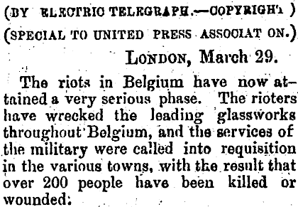 (BY KLSOTBIO TELRGBAPB.— OOPYBIGH'i ) (SPECIAL TO UNITED PBESS ABSOOIAT ON.), London, March 29. The riots m Belgium have now attained a very serious phase. The rioters have wrecked the leading glassworks throughout' Belgium, "and the services of the military were called into requisition m the various towns, with the. result that over 200 people have been killed or wounded: