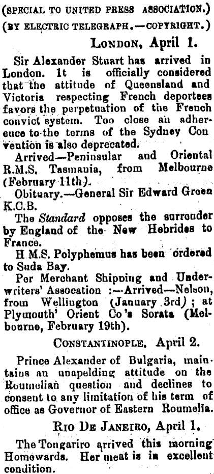 (SPECIAL TO UNITED PBESB ASSOCIATION.) (BY ELECTRIC TELEGBAPH.— COPYRIGHT.) London, April 1. Sir Alexander Stuart has arrived m London. It is officially considered that the attitude of Queensland and Victoria respecting French deportees favors the perpetuation of the French] convict syßtein. Too close ah adhereuce to the terms of the Sydney Con veo tion is also deprecated; Arrived— Peninsular and Oriental R.M.S, Tastnauia, from Melbourne (February 11th . Obituary.— General Sir Edward Green K.C.B. , The Standard opposes the surrender by England of the New Hebrides to France. , I H M.S. Polyphemus has been ordered to Sada Bay. Per Merchant Shipoiug and Underwriters' Asaocation :— Arrived — Nelaou, from Wellington (January 3rd^ ; at Plymouth 1 Orient Co 1 ! Sorata (Melbourne, February 19th). Constantinople. April 2. Prince Alexander of Bulgaria, maintains an uoapolding attitude on the Koutnulian question and declines to consent to any limitation of his term of office as Governor of Eastern Roumelia. Kio Da Janeiro, April 1. TheTongariro arrived this morning Homewards. Her meat is i« excellent condition. ;