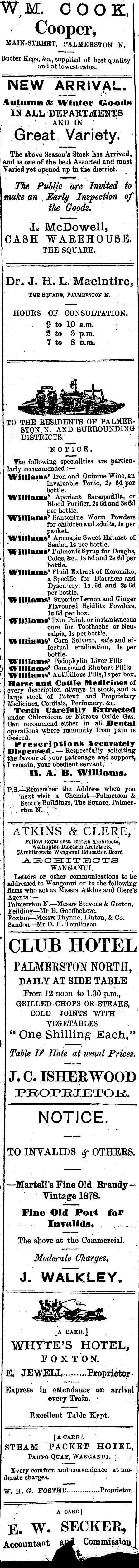 W,M. OOOE. Cooper, MAIN-STREET, PALMERSTON N. Butter Kegs, &c, supplied of best quality ' and at lowest rates.. NEW ARRIVAL. Autumn & Winter Goods IN ALL DEPARTMENTS ,■/, . ; AND IN- ■ : Great Variety. The above Season's Stock has Arrived, and is one of the be«t Assorted and most Varied yet opened up m the district. The Public are Invited to make an Early Inspection of the Goods. J. McDowells CASH WAKEHOTJSE. THE SQUAEE. Dr. J. H. L. Macintire, The Square, Palmebstok n. HOURS OF CONSULTATION. 9 to 10 a.m. | 2 to 3 p.m. 7 to 8 t).m. to the residents of palmerston n. and surrounding districts. notTce. The following specialities are particularly recommended : — Williams' Iron and Quinine Wine, an " invaluable Tonic, 3s 64 per bottle. Williams' Aperient Sarsapafilla, or Blood Purifier, 2s Mand 3s 6d perhottle. . : Williams' Santonine Worm Powders for childien and adults, Is per . . . packet. Williams' Aromatic Sweet Extract of Senna, Is per bottle. Williams' Pulmonic Syrup for Coughs, Colds, &c. Is 6dand 2s 6dper bottle. Williams' Fluid Extra ;t of Koromiko, a Specific for Diarrhoea and Dysen'ery, ls.6d and 2s 6d •■■..' per bottle. Williams' Superior Lemon and Ginger v Flavoured Seidlitz Powders, Is 6d per box. Williams' Pain Paint, or instantaneous cure for Toothache or Neuralgia, Is per bottle. Williams' Corn Solvent, safe and effectual eradication, Is per bottle. Williams' Pbdophylin Liver Pills Williams' Compound Rhubarb Pillls 'Williams' Antibilious Pills, Is per box. Horse anil Cattle Rledlcines of every description, always m stock, and a large stock of Patent and ProprietaryMedicines, Cordials, Perfumery, &c. Teeth Carefully Extracted under Chloroform or Nitrous Oxide Gas. Can recommend either m all Dental operations where immunity from pain is desired. ■ Prescriptions Accurately Dispensed. — Respectfully soliciting the favour of your patronage and support, I remain, your obedient servant,' ■ 11. A. B. Williams. p # g #^]Jemeinber the Address when you next visit a • Chemist—^-Palmerson &. .. . Scott's Buildings, The Square, Palmer.V ; stonN.. ' -. TtkiNs & cle.re; Fellow Royal Inst. British Architects, Wellington Diocesan Architects. JArchitects to Wanganui Education Board ABCHITECTS WANGANUI. Letters or other communications to be addressed to Wanganui or to the following firms who act as Messrs Atkins and Clere's Agents : — Palmerston N* — Messrs Stevens & Gorton. Feilding — Mr E. Goodbehere. Foxton — Messrs Thynne, Linton, & Co. i Sandon — Mr C. H. Tomlinson CLUB HOTEL PALMERSTON NORTH, DAILY AT SIDE TABLE "From 12 noon to 1.30 p.m., GRILLED CHOPS OR STEAKS, COLD JOINTS WITH VEGETABLES " One Shilling Each," Table £>' Hoie at usual Prices. J. C. ISHEKWOOD NOTICE. TO INVALIDS #• OTHERS. — Martell's Fine Old Brandy - Vintage 1878. Fine Old Port for Invalids, , . . :. . The above at the Commercial. Moderate Charges. J. WALKLEY. [a cabd.J WHYTE'S HOTEL, FOXTON. E. JEWELL... ProprietorExpress m attendance on arrival' every Train. ; Excellent Table Kjppt. [ACAED|. STEAM PACKET HOTEL, Taupo Quay, Wanganui. ; ./ Every comfort and convenience at moderate charges. W. H. G. FOSTEK ...Proprietor. ..'.. A CARDJ E. W. SECKER, Accountant CommUsixift^