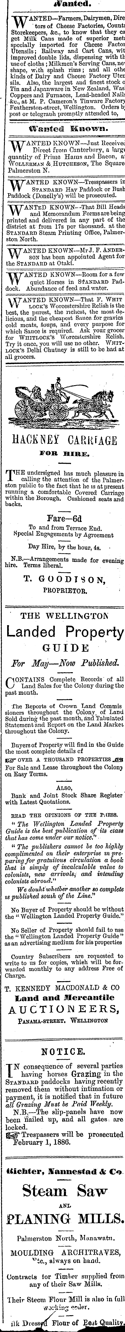 4% 7 aiitcd. WANTED— Farmers, Dairymen, Dire< tors of Cheese Factories, Countr Storekeepers, &c., to know that they ca: get Milk Cans made of superior meta specially imported for Cheese Factor; Utensils; Railway and Cart Cans, wit] improved double lids, dispensing with th use of cloths ; Milkmen's Serving Cans.nev shape, with splash rims ; and all othe kinds of Dairy and Cheese Factory Uten sils. Also, the largest and finest stock o: Tin and Japanware m New Zealand, Wasl Coppers and Furnaces, Lead-headed Nails •&c., atM. P. Cameron's Tinware Factory ' Featherston-strcet, Wellington. Orders bj post or telegrauh promptly attended to, WaastesS I£newEi. "TTTANTED KNOWN— Just Received VV Direct from Canterbury, a large quantity of Prime Hams and Bacon, at WoLTiRRMAN &.HuTCHESON, The Square, Palmerston N. ANTED KNOWN— Trespassers m Standard Hay Paddock or Bush Paddock (Donelly's) Will be prosecuted. ANTED KNOWN— That Bill Heads and Memorandum Forms are being printed and delivered m any part of the district at from 17s per thousand, at the Standard Steam Printing Office, Palmerston North. TTTANTBD KNOWN— Mr J. F. AUDEBVV son has been appointed Agent for the Standard at Otaki. "TTTANTED KNOWN— Koom for a few YT quiet Horses m Standard Paddock. Abundance of feed and water. \XT ANTED KNOWN— That F. Whit V V loc k's Worcestershire Relish is the best, the purest, the richest, the most delicious, and the cheapest Stuice. for gravies cold meats, Soups, and every purpose for which Sauce is required. Ask your grocer for Whitlock's Worcestershire Relish. Try it once, you will use no other. Whitlock's Delhi Chutney is still to be had at all grocers. HACKNEY CARiUAGE FOR HIIUE. TEE undersigned has much pleasure m calling the attention of the Palmerston public to the fact that he is at present running a comfortable Covered Carnage within the Borough. Cushioned seats and backs. Fare— 6d To and from Terrace End. Special Engagements by Agreement Day Hire, by the hour, 4s. • N.B.— Arrangements made for evening hire. Terms liberal. T. GOO~DJSON, PROPRIETOB. THE WELLINGTOJV Landed Property GUIDE For May — Now Published. /"CONTAINS Complete Records of all VJ Land Sales for the Colony during the past month. The Beports of Crown Land Commis sioners throughout the Colony, of Land Sold during the past month, and Tabulated Statement and Report on the Land Market throughout the Colony. Buyers of Property will find m the Guide the most complete details cf B®-OVEIt A THOUSAND PROPERTIES jfg» For Sale and Lease throughout the Colony on Easy Terms. Also, Bank and Joint Stock Share Register with Latest Quotations. READ THE OPINIONS OF THE PjIESS. " The Wellington Landed Properly Gtiide is the best publication of its class that has come under our notice' 1 " The publishers cannot he too highly complimented on their enterprise m preparing: for gratuitous circulation a book that is simjdy of incalculable value to colonists, new arrivals^ and intending colonists abroad." We douM whether another so complete is published south of the Line" No Buyer of Property should be without the "Wellington Landed Property Guide." No Seller of Property should fail to use the " Wellington Landed Property Guide " as an advertising medium for his properties Country Subscribers aTe requested to write to us for copies, which will be forwarded monthly to any address Free of Charge. T. KENNEDY MACDONALD & CO liand and iff ercantiße AUCTIONEERS, Panama-street, WEmNOTON NOTICE. TN consequence of several parties having horses Grazing m the Standabd paddocks having recently removed them without intimation or payment, it is notified that m future all Grazing Must be Paid Weekly. TO, — The slip-panels have now been Bailed up, and all gates ; are locked. Iggir Trespassers will be prosecuted February 1, 1886. iiicliter, Jtfaiinestad & Co Steam Sa^ ANL PLANING MILLS. Palmerston North, Manawatu. MOULDING "ARCHITRAVES, w tc, always on hand. Contracts ior Timber supplied from any of their Saw Mills. Their Stecm Flour Mill is also m full wovki!3£ «rder. ilk Dvessfa Flour of Eeaj^uality.