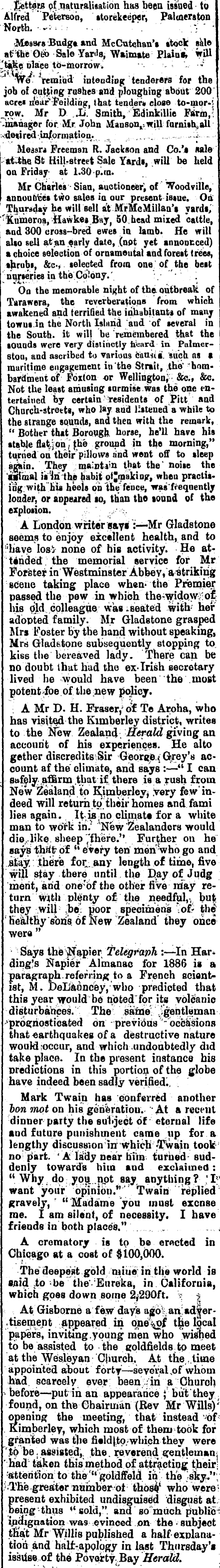 jtettaiß of naturalisation has been issued to Alfred "Peterson, »torekeeper, Palcaeraton North. •-- ....' '. -. ' ■ -Messrs Budg» and McCutqhan't •tock sale afthe Otb Sale Yards, Waimate Plains, will .'t»k<s Dlace to-morrow. •■• - •» J W<f' remind intending tenderers for the ! job of cutting rashes and ploughing about 200 } acre* ireiir'-I'eiiditigr, that tender* close to-mor-j _row. Mr D Xi. Smith, Edinkillie Firm,' for Mr John Manson^wiU farniih^aU -rf^ired -.information., .... -. ■- -■■■ ■■■ -• — Measn Freeman R. Jackson and Co.'» twle tttbe Sfc Hill-stfeet Sale YarJi, will be held on Friday- at 1.30 p.m. Mr Charles • Sian, auctioneer, of "Voodville, annou Bices two sales ia our present ißtue. On Thursday he will sell ait MrMeMillaa't yards; r Kumeroa, Hawke* Bay, SO head mixed cattle, and 300 cross-bred ewes m lamb. He will also sell at >n early date, (not yet announced) a choice selection of ornameutal and forest trees, •hrubi, &c-, . selected from one of the best nurseries m the.Colony.' • '• ; On the memorable night of the. outbreak of Tarawera, the reverberations frotn which awakened and terrified the inhabitant* of many towus.in the North Island and of several m tbe South, it will be remembered that the sounds were very distinctly iftnrd m Palmerstou, and ascribed to varioas cutuii'. such, as a maritime engagement m 'the Strait, .the' 'bombardment of Foxton or Wellington;- &c., &c. Not the least amusing surmise. was the one entertained by certain residents of Pitt and Charch-streets, who lay and listened a while to the strange sounds, and then with the remark, " Bother that Borough horse, he'll have his stable flagon, fhe ground m the morning," turned on their pillo\v« dnd went off to sleep again. They maintain that the' noise the agimal is In the habit o^makinjr, wbeu practising with his heels ob the fence, was frequently loader, or appeared so, than the sound of the explosion. ; ,/ % A London writer «ay« :— Mr Gladstone seems to enjoy excellent health, and to 'have loss none of bis activity. He attended the memorial service for Mr Fofster m Westminster Abbey, aitriking scene taking place when* the Premier passed the pew m which the-widow of his old, colleague was .seated with her adopted family. Mr Gladstone grasped Mrs Foster by the hand without speaking, Mrs Gladstone subsequently stopping to kiss the bereaved lady. There can be no doubt that had the ex- Irish secretary lived he would have been the .most potent Joe of the new policy. A Mr D. H. Eraser/ of Te Aroha, who has visited the Kimberley district, writes to the New Zealand. Herald giving an account of his experiences. He alto gether discredits .Sir George < Grey's account af the' climate, and says : — " I can safely affirm .that if there is a rush from New Zealand to Kimberley j .very few'indeed will return to their homes and fami lies again. It-is no climate for a white man to work in;' v New Zealanders would die-like, sheep " ( '{here." Further on he says thtfir of " every ten merrwho go and ijtaj : there for.: any length of time, five will stay there until the Day of Judg merit, and one'of the other five nfay return with plenty of the needful,-, but; they will .he; poor ; specimens *o£ the! : healthy son's, of New Zealand they once wera " • -Says the ■ Napier Telegraph :— ln Har* ding's Napier Almanac for 1886 i* a paragraph referring to a French sciflntist, M. Deliaoncey, who predicted that this year would be noted for its volcanic disturbances. The satoe rgentlaman 'prognosticated on - previous "occasions that earthquakes of a destructive nature would ;occur, and which undoubtedly did take place. In the present instance his predictions m this portion of the globe have indeed been sadly verified.. . Mark Twain has conferred another ton mot on his generation.' " At a recent dinner party the subject of eternal life and future punishment came tip for a lengthy discussion inf Which i -Twain took no part. ' A Lady near him. turned- suddenly towards him and exclaimed : " Why dp - you ..not say, anything ? _," If want your opinion. I Twain replied gravely, ' "Madame you must excuse me. lam silent, of necessity. I have friends m both places." A crematory is to be erected m Chicago at a cost of $100,000. The deepest gold mine m; the world is said .to be the' Eureka, m California, which goes down Borne 2;290ft. ? > : At. Gisborne a few days us;o' a aniad|ertisement ttpjjeared m qne^of the Igcal papers, inviting .young men who wished to be assisted to the goldfields to meet at the Wesleyan : Clmrch. At the ..lime appointed about forty— several ,of whom had r scarcely^ ever: beeni/in a Churoli before — put m an appearance } but they . found, on the Chairman (Rev Mr Wills)' opening the meeting, that instead of Kimberley, which most of them took for granted was the fi«ld|to. which they were 'to be. assisted;, the. reverend gentleman j had taken this method of attracting their; "atfedtiion; to the r " goldfFeid in' the -The greater number ot thos^' who were i present exhibited undisguised disgust at being thus '«. sold,", and so much piublict indignation wa9 evinced on the v subject that Mr Willis published a half explanation and half -apology m last Thursday 'i issUse of the Poverty. Bay Herald. ]